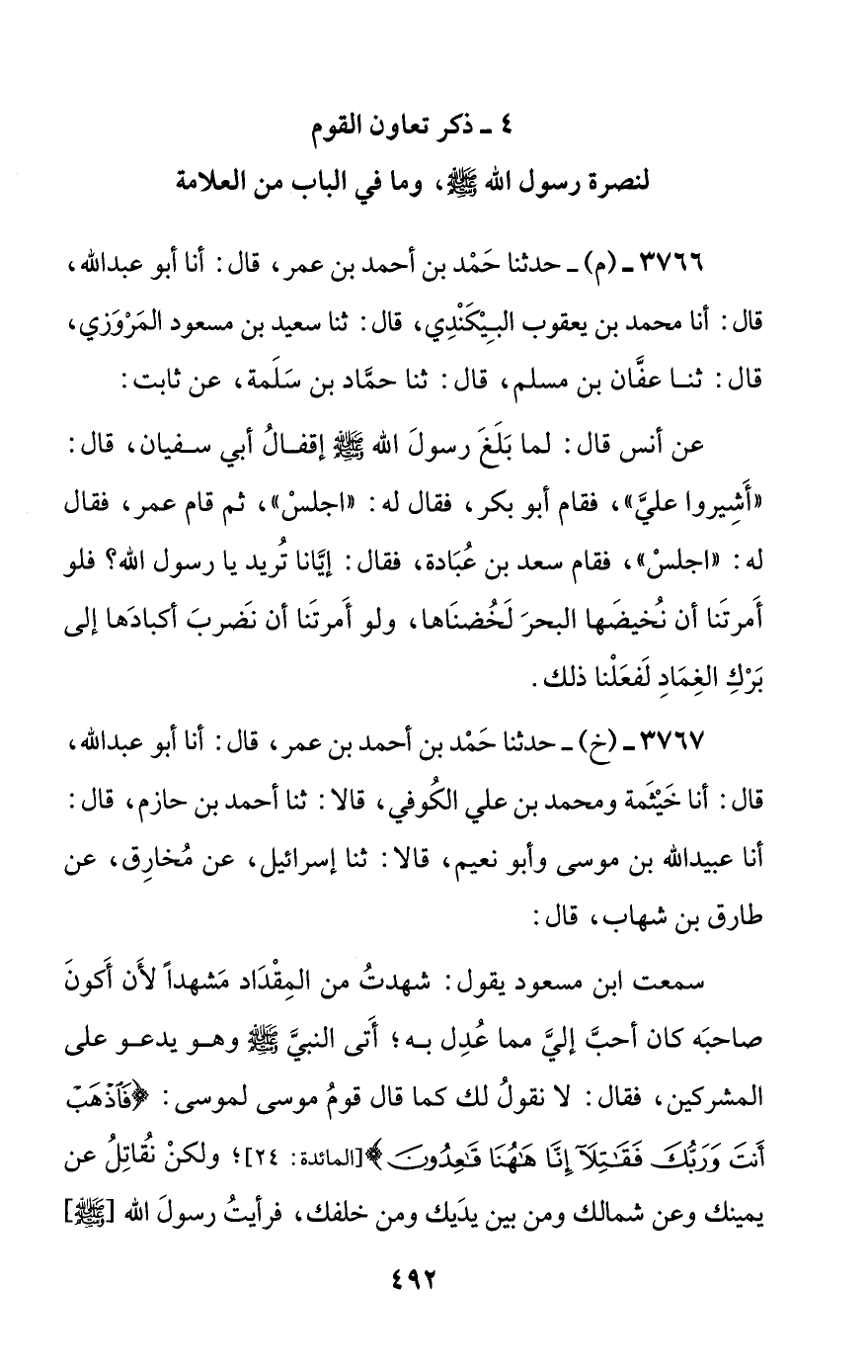 سمعت ابن مسعود يقول: شهدت من المقداد مشهدا لأن أكون صاحبه كان أحب إلي مما عدل به؛ أتى النبي صلى الله عليه وسلم وهو يدعو على المشركين، فقال: لا نقول لك كما قال قوم موسى لموسى: {فاذهب أنت وربك فقاتلا إنا ههنا قاعدون}؛ ولكن نقاتل عن يمينك وعن شمالك ومن بين يديك ومن خلفك، فرأيت رسول الله [صلى الله عليه وسلم] #493# أشرق لذلك وسره.