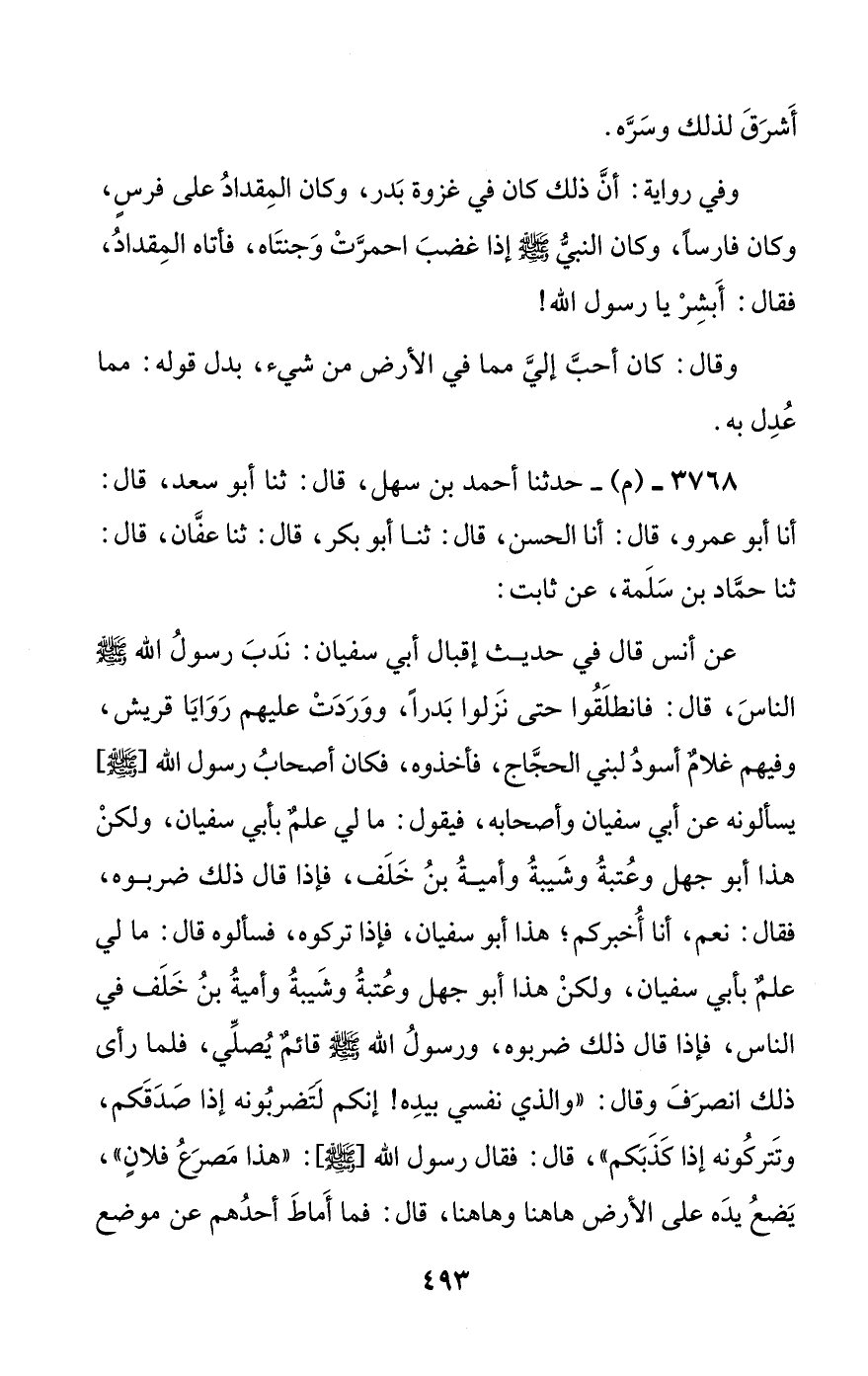 عن أنس قال في حديث إقبال أبي سفيان: ندب رسول الله صلى الله عليه وسلم الناس، قال: فانطلقوا حتى نزلوا بدرا، ووردت عليهم روايا قريش، وفيهم غلام أسود لبني الحجاج، فأخذوه، فكان أصحاب رسول الله [صلى الله عليه وسلم] يسألونه عن أبي سفيان وأصحابه، فيقول: ما لي علم بأبي سفيان، ولكن هذا أبو جهل وعتبة وشيبة وأمية بن خلف، فإذا قال ذلك ضربوه، فقال: نعم، أنا أخبركم؛ هذا أبو سفيان، فإذا تركوه، فسألوه قال: ما لي علم بأبي سفيان، ولكن هذا أبو جهل وعتبة وشيبة وأمية بن خلف في الناس، فإذا قال ذلك ضربوه، ورسول الله صلى الله عليه وسلم قائم يصلي، فلما رأى ذلك انصرف وقال: ((والذي نفسي بيده! إنكم لتضربونه إذا صدقكم، وتتركونه إذا كذبكم))، قال: فقال رسول الله [صلى الله عليه وسلم]: ((هذا مصرع فلان))، يضع يده على الأرض هاهنا وهاهنا، قال: فما أماط أحدهم عن موضع #494# يد رسول الله صلى الله عليه وسلم.