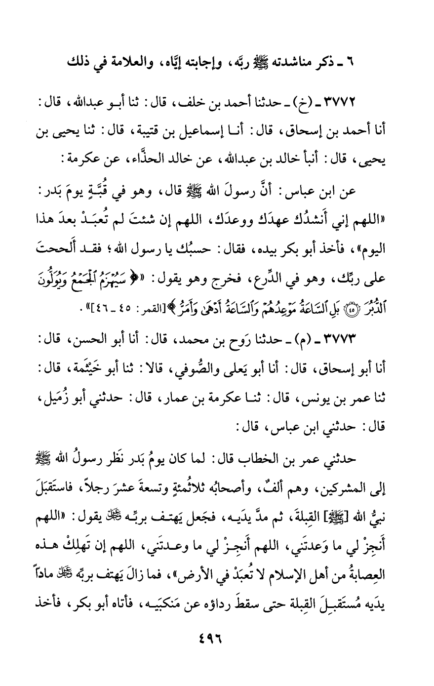 عن ابن عباس: أن رسول الله صلى الله عليه وسلم قال، وهو في قبة يوم بدر: ((اللهم إني أنشدك عهدك ووعدك، اللهم إن شئت لم تعبد بعد هذا اليوم))، فأخذ أبو بكر بيده، فقال: حسبك يا رسول الله؛ فقد ألححت على ربك، وهو في الدرع، فخرج وهو يقول: (({سيهزم الجمع ويولون الدبر. بل الساعة موعدهم والساعة أدهى وأمر})).