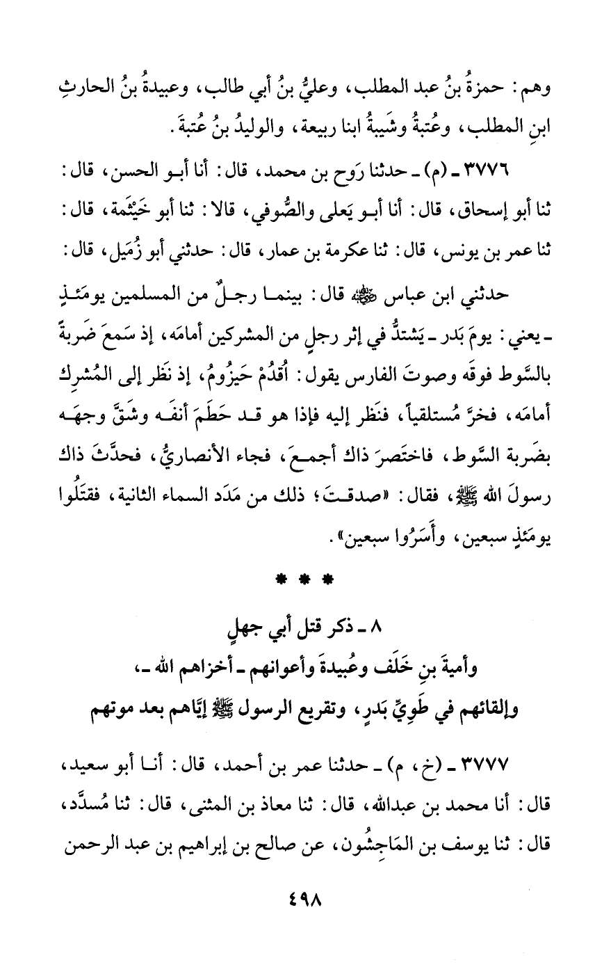 3777 - (خ، م) - حدثنا عمر بن أحمد، قال: أنا أبو سعيد، قال: أنا محمد بن عبد الله، قال: ثنا معاذ بن المثنى، قال: ثنا مسدد، قال: ثنا يوسف بن الماجشون، عن صالح بن إبراهيم بن عبد الرحمن #499# ابن عوف، عن أبيه: