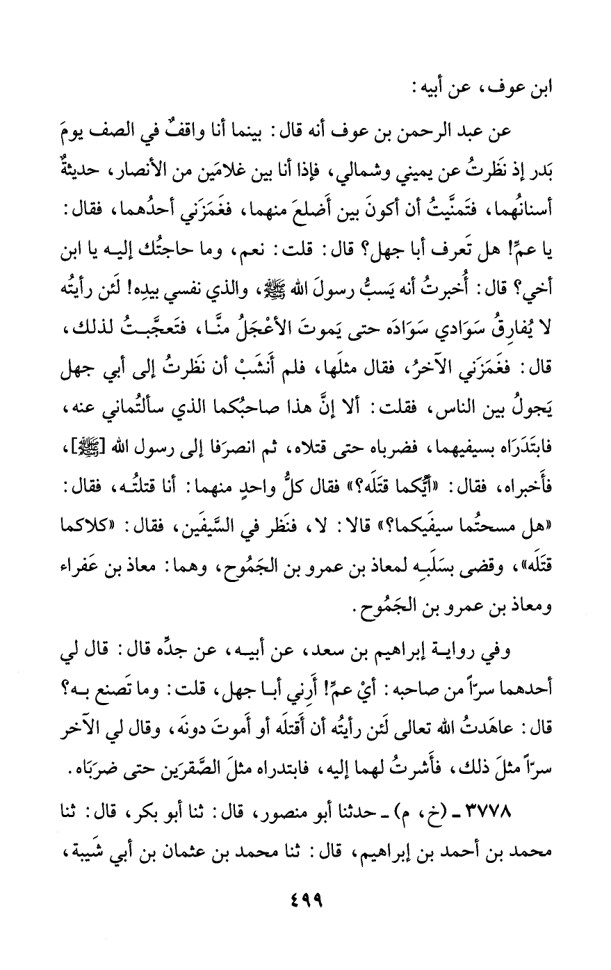 أن أنسا حدثهم قال: قال النبي صلى الله عليه وسلم: ((من ينظر ما صنع أبو جهل؟)) قال: فانطلق عبد الله بن مسعود، فوجد ابني عفراء قد ضرباه حتى برك، قال: فأخذ بلحيته ابن مسعود، وقال: أنت أبو جهل؟ أنت الشيخ الضال؟ فقال أبو جهل: هل فوق رجل قتلتموه، أو: قتله قومه؟!
