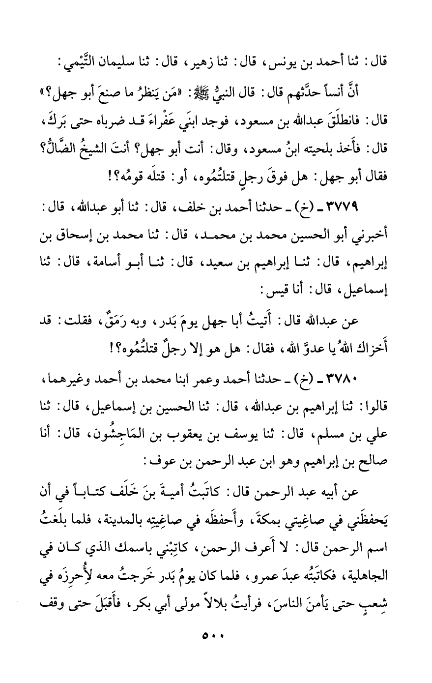 3780 - (خ) - حدثنا أحمد وعمر ابنا محمد بن أحمد وغيرهما، قالوا: ثنا إبراهيم بن عبد الله، قال: ثنا الحسين بن إسماعيل، قال: ثنا علي بن مسلم، قال: ثنا يوسف بن يعقوب بن الماجشون، قال: أنا صالح بن إبراهيم وهو ابن عبد الرحمن بن عوف: