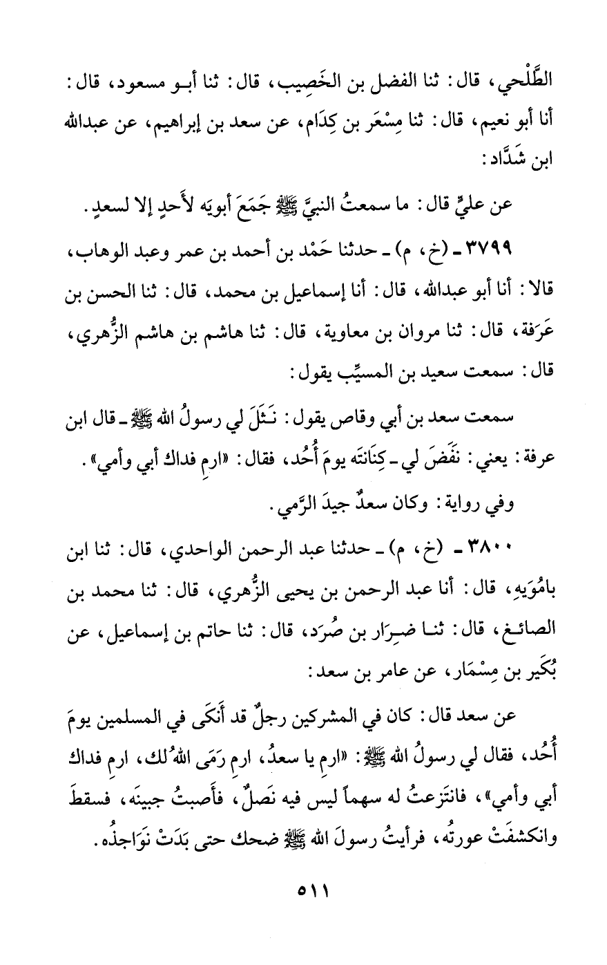 3800 - (خ، م) - حدثنا عبد الرحمن الواحدي، قال: ثنا ابن بامويه، قال: أنا عبد الرحمن بن يحيى الزهري، قال: ثنا محمد بن الصائغ، قال: ثنا ضرار بن صرد، قال: ثنا حاتم بن إسماعيل، عن بكير بن مسمار، عن عامر بن سعد: