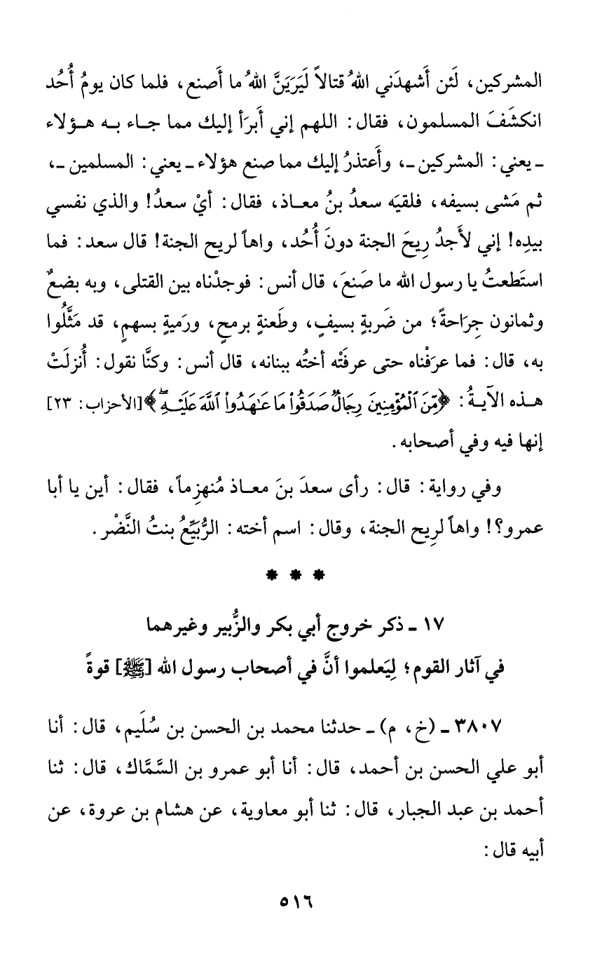 [17] ذكر خروج أبي بكر والزبير وغيرهما في آثار القوم؛ ليعلموا أن في أصحاب رسول الله [صلى الله عليه وسلم] قوة