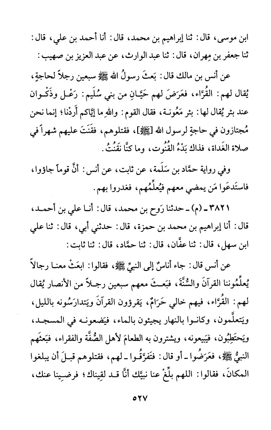 عن أنس قال: جاء أناس إلى النبي صلى الله عليه وسلم، فقالوا: ابعث معنا رجالا يعلموننا القرآن والسنة، فبعث معهم سبعين رجلا من الأنصار يقال لهم: القراء، فيهم خالي حرام، يقرؤون القرآن ويتدارسونه بالليل، ويتعلمون، وكانوا بالنهار يجيئون بالماء، فيضعونه في المسجد، ويحتطبون، فيبيعونه، ويشترون به الطعام لأهل الصفة والفقراء، فبعثهم النبي صلى الله عليه وسلم، فعرضوا -أو قال: فتفرقوا- لهم، فقتلوهم قبل أن يبلغوا المكان، فقالوا: اللهم بلغ عنا نبيك أنا قد لقيناك؛ فرضينا عنك، #528# ورضيت عنا، قال أنس: وأتى رجل حراما من خلفه، فطعنه بالرمح حتى أنفذه، فقال حرام: فزت ورب الكعبة، فقال رسول الله [صلى الله عليه وسلم] لأصحابه: ((إن إخوانكم قد قتلوا، وإنهم قالوا لربهم عز وجل: اللهم بلغ عنا نبيك أنا قد لقيناك؛ فرضينا عنك، ورضيت عنا)).