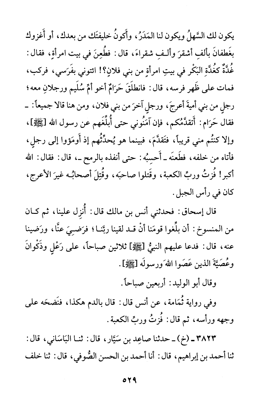3823 - (خ) - حدثنا صاعد بن سيار، قال: ثنا الباساني، قال: ثنا أحمد بن إبراهيم، قال: أنا أحمد بن الحسن الصوفي، قال: ثنا خلف #530# ابن سالم، قال: ثنا أبو أسامة، قال: ثنا هشام بن عروة، عن أبيه: