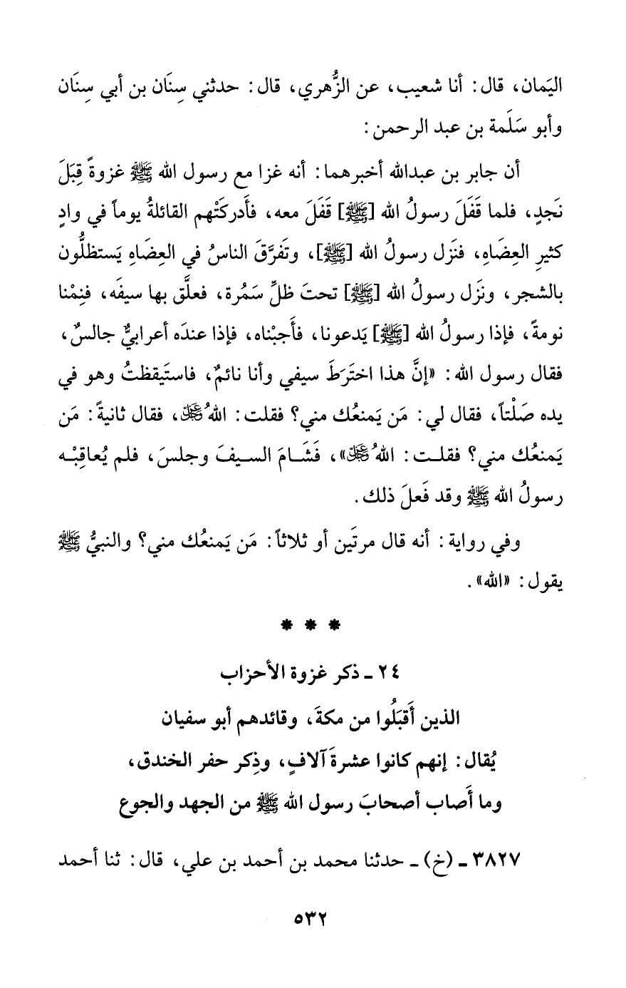[24] ذكر غزوة الأحزاب الذين أقبلوا من مكة، وقائدهم أبو سفيان يقال: إنهم كانوا عشرة آلاف، وذكر حفر الخندق، وما أصاب أصحاب رسول الله صلى الله عليه وسلم من الجهد والجوع