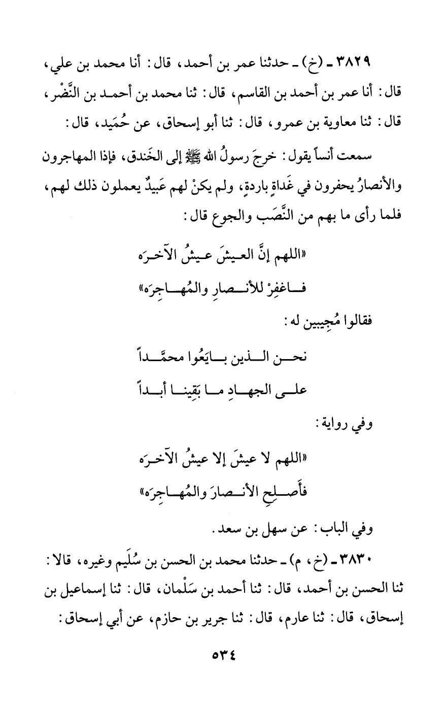 3830 - (خ، م) - حدثنا محمد بن الحسن بن سليم وغيره، قالا: ثنا الحسن بن أحمد، قال: ثنا أحمد بن سلمان، قال: ثنا إسماعيل بن إسحاق، قال: ثنا عارم، قال: ثنا جرير بن حازم، عن أبي إسحاق: