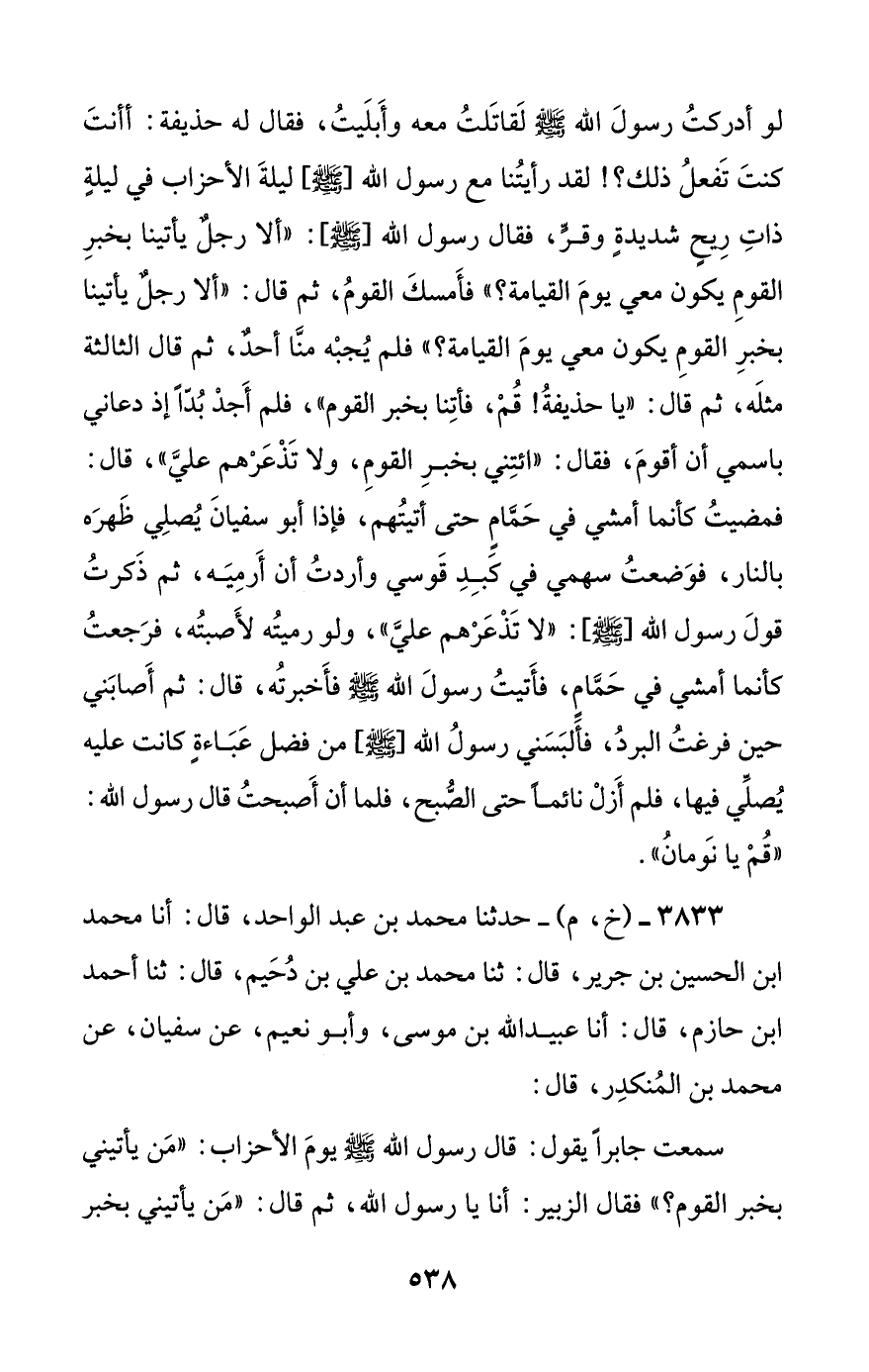 3833 - (خ، م) - حدثنا محمد بن عبد الواحد، قال: أنا محمد بن الحسين بن جرير، قال: ثنا محمد بن علي بن دحيم، قال: ثنا أحمد بن حازم، قال: أنا عبيد الله بن موسى، وأبو نعيم، عن سفيان، عن محمد بن المنكدر، قال: