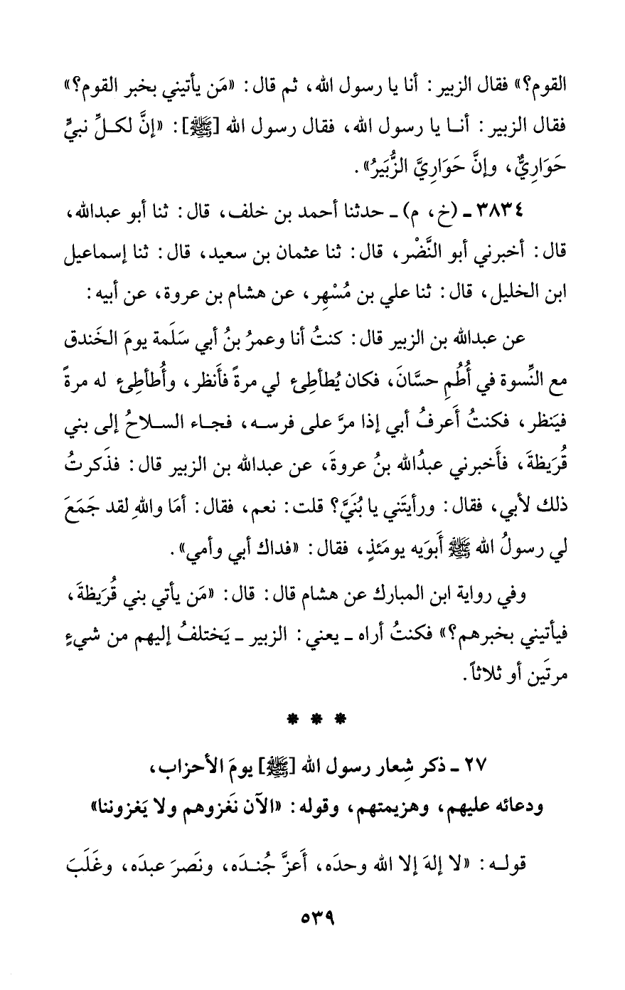 عن عبد الله بن الزبير قال: كنت أنا وعمر بن أبي سلمة يوم الخندق مع النسوة في أطم حسان، فكان يطأطئ لي مرة فأنظر، وأطأطئ له مرة فينظر، فكنت أعرف أبي إذا مر على فرسه، فجاء السلاح إلى بني قريظة، فأخبرني عبد الله بن عروة، عن عبد الله بن الزبير قال: فذكرت ذلك لأبي، فقال: ورأيتني يا بني؟ قلت: نعم، فقال: أما والله لقد جمع لي رسول الله صلى الله عليه وسلم أبويه يومئذ، فقال: ((فداك أبي وأمي)).