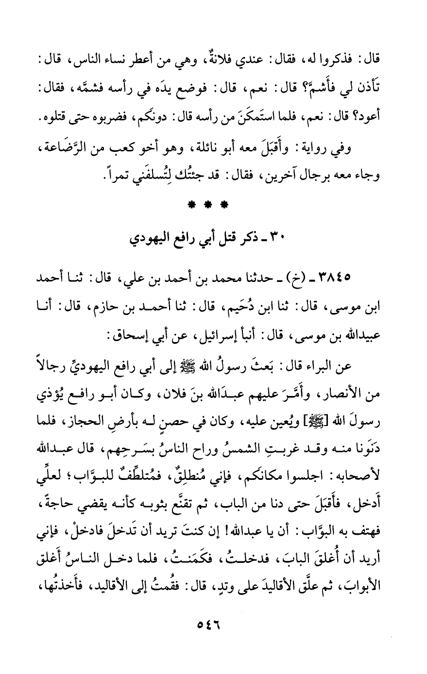 عن البراء قال: بعث رسول الله صلى الله عليه وسلم إلى أبي رافع اليهودي رجالا من الأنصار، وأمر عليهم عبد الله بن فلان، وكان أبو رافع يؤذي رسول الله [صلى الله عليه وسلم] ويعين عليه، وكان في حصن له بأرض الحجاز، فلما دنونا منه وقد غربت الشمس وراح الناس بسرحهم، قال عبد الله لأصحابه: اجلسوا مكانكم، فإني منطلق، فمتلطف للبواب؛ لعلي أدخل، فأقبل حتى دنا من الباب، ثم تقنع بثوبه كأنه يقضي حاجة، فهتف به البواب: أن يا عبد الله! إن كنت تريد أن تدخل فادخل، فإني أريد أن أغلق الباب، فدخلت، فكمنت، فلما دخل الناس أغلق الأبواب، ثم علق الأقاليد على وتد، قال: فقمت إلى الأقاليد، فأخذتها، #547# ففتحت الباب، وكان أبو رافع يسمر عنده، وكان في علالي له، فلما أن ذهب عنه أهل سمره صعدت إليه، فجعلت كلما فتحت بابا أغلقته علي من داخل، قلت: إن القوم نذروا بي لم يخلصوا إلي حتى أقتله، فانتهيت إليه، فإذا هو في بيت مظلم وسط عياله، لا أدري أين هو من البيت، قلت: أبا رافع! قال: من هذا؟ فأهويت نحو الصوت، فأضربه ضربة بالسيف، وأنا دهش، فما أغنت شيئا، وصاح، وخرجت من البيت، فأمكث غير بعيد، ثم دخلت إليه، فقلت: ما هذا الصوت يا أبا رافع؟ قال: لأمك الويل! إن رجلا في البيت ضربني قبل بالسيف، قال: فأضربه ضربة أثخنته، ولم أقتله، ثم وضعت ظبة السيف في بطنه حتى أخذ في ظهره، فعرفت أني قد قتلته، فجعلت أفتح الأبواب بابا فبابا، حتى انتهيت إلى درجة، فوضعت وأنا أرى أني قد انتهيت إلى الأرض، فوقعت في ليلة مقمرة، فانكسرت ساقي، فعصبتها بعمامة، ثم انطلقت حتى جلست عند الباب، فقلت: لا أبرح الليلة حتى أعلم أقتلته؟ فلما صاح الديك قام الناعي على السور، فقال: أنعى أبا رافع، قال: فانطلقت إلى أصحابي، فقلت: النجاء النجاء، قد قتل الله أبا رافع، فانتهينا إلى النبي صلى الله عليه وسلم، فحدثته، فقال: ((ابسط رجلك))، فبسطت رجلي، فمسحها، فكأنها لم أشتكها قط.