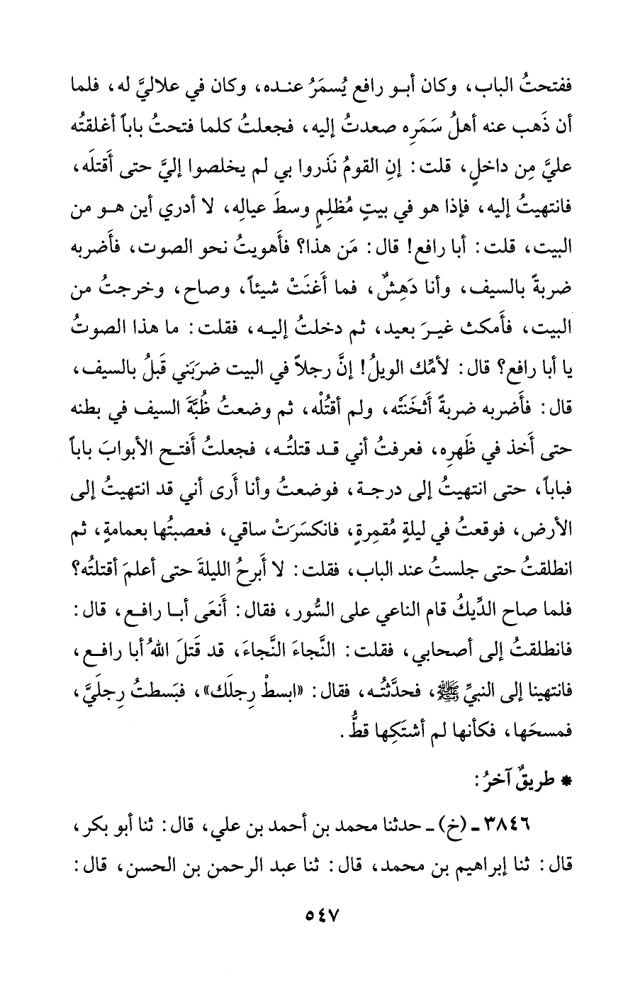 سمعت البراء بن عازب يقول: بعث رسول الله صلى الله عليه وسلم إلى أبي رافع عبد الله بن عتيك وعبد الله بن عتبة في ناس معهم، فانطلقوا حتى دنوا من الحصن، ففقدوا حمارا لهم، قال: فخرجوا بقبس يطلبونه، فخشيت أن أعرف، قال: فغطيت رأسي، وجعلت كأني أقضي حاجة، ثم نادى صاحب الباب: من أراد أن يدخل فليدخل قبل أن أغلقه، فدخلت، ثم اختبأت في مربط حمار عند باب الحصن، فتعشوا عند أبي رافع، وتحدثوا حتى ذهب ساعة من الليل، ثم رجعوا إلى بيوتهم، فلما هدأت الأصوات ولا أسمع حركة خرجت، قال: ورأيت صاحب الباب حيث وضع مفتاح الحصن في كفة -أو: كوة، الشك من عبد الرحمن-، فأخذته، ففتحت باب الحصن، قال: قلت: إن نذر بي القوم انطلقت على مهل، قال: ثم عمدت إلى أبواب بيوتهم، فغلقتها عليهم من ظاهره، ثم صعدت إلى أبي رافع في سلم، فإذا البيت مظلم قد طفئ سراجه، فلم أدر أين الرجل، فقلت: يا أبا رافع! قال: من هذا؟ فعمدت نحو الصوت، فأضربه، وصاح، فلم يغن شيئا، ثم جئت كأني أغيثه، فقلت: ما لك يا أبا رافع؟ وغيرت صوتي، فقال: ألا أعجبك لأمك الويل؟! دخل علي رجل، فضربني بالسيف، قال: فعمدت له أيضا، فأضربه أخرى، فلم يغن شيئا، فصاح، وقام أهله، قال: ثم جئت وغيرت صوتي كهيئة المغيث، فإذا هو مستلق على ظهره، فأضع في بطنه، #549# ثم أتكئ عليه حتى سمعت صوت العظم، ثم خرجت دهشا، حتى أتيت السلم أريد أن أنزل، فأسقط منه، فانخلعت رجلي، فعصبتها، ثم أتيت أصحابي أحجل، فقلت: انطلقوا، فبشروا رسول الله [صلى الله عليه وسلم]؛ فإني لا أبرح حتى أسمع الناعية، فلما كان في وجه الصبح صعد [ت] الناعية، فقالت: أنعى أبا رافع، فقمت أمشي ما بي قلبة، فأدركت أصحابي قبل أن يأتوا النبي صلى الله عليه وسلم، فبشرته.