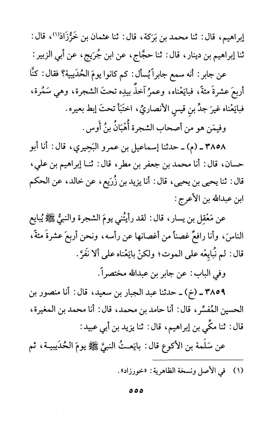 3859 - (خ) - حدثنا عبد الجبار بن سعيد، قال: أنا منصور بن الحسين المفسر، قال: أنا حامد بن محمد، قال: أنا محمد بن المغيرة، قال: ثنا مكي بن إبراهيم، قال: ثنا يزيد بن أبي عبيد:
