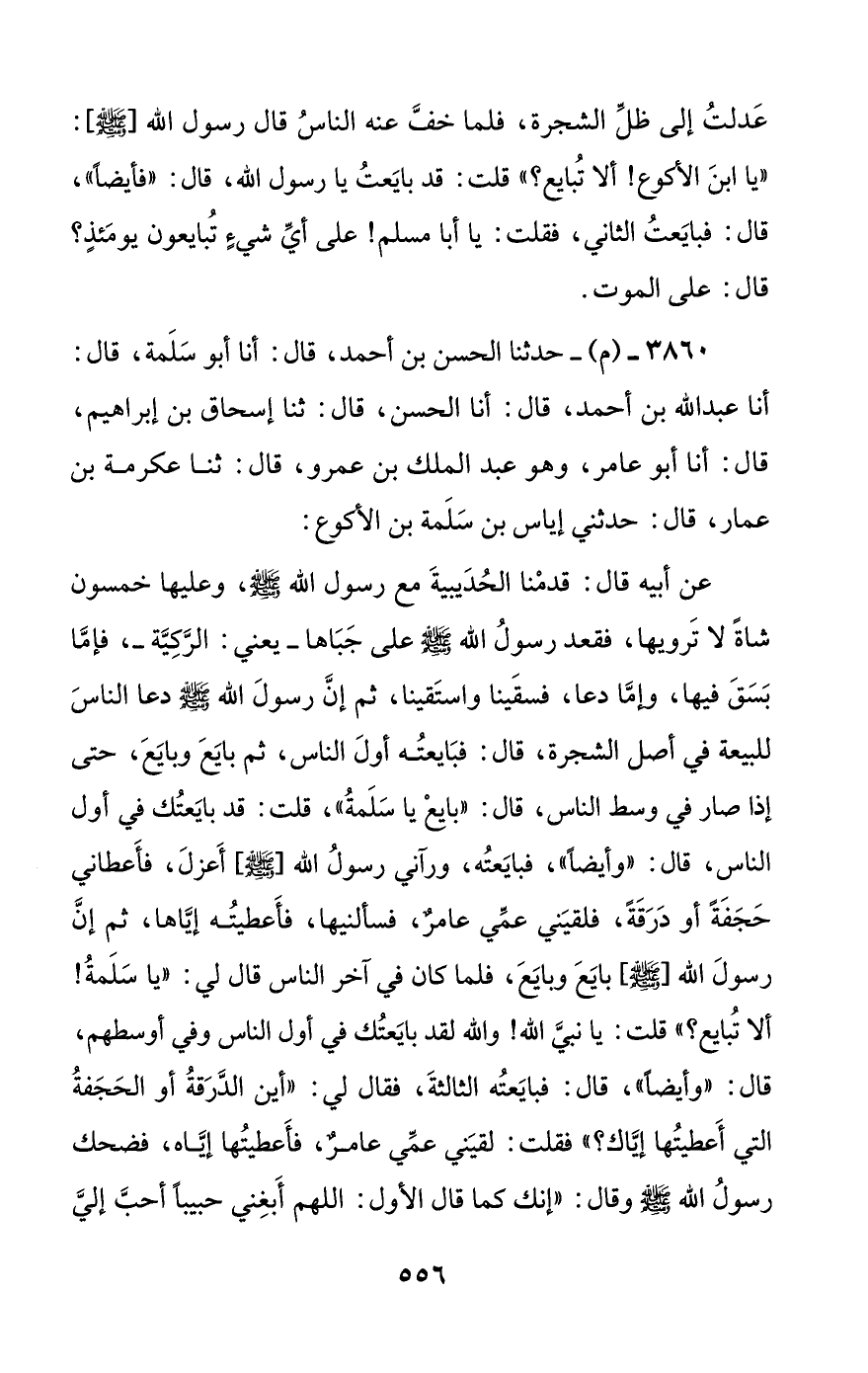 عن أبيه قال: قدمنا الحديبية مع رسول الله صلى الله عليه وسلم، وعليها خمسون شاة لا ترويها، فقعد رسول الله صلى الله عليه وسلم على جباها -يعني: الركية-، فإما بسق فيها، وإما دعا، فسقينا واستقينا، ثم إن رسول الله صلى الله عليه وسلم دعا الناس للبيعة في أصل الشجرة، قال: فبايعته أول الناس، ثم بايع وبايع، حتى إذا صار في وسط الناس، قال: ((بايع يا سلمة))، قلت: قد بايعتك في أول الناس، قال: ((وأيضا))، فبايعته، ورآني رسول الله [صلى الله عليه وسلم] أعزل، فأعطاني حجفة أو درقة، فلقيني عمي عامر، فسألنيها، فأعطيته إياها، ثم إن رسول الله [صلى الله عليه وسلم] بايع وبايع، فلما كان في آخر الناس قال لي: ((يا سلمة! ألا تبايع؟)) قلت: يا نبي الله! والله لقد بايعتك في أول الناس وفي أوسطهم، قال: ((وأيضا))، قال: فبايعته الثالثة، فقال لي: ((أين الدرقة أو الحجفة التي أعطيتها إياك؟)) فقلت: لقيني عمي عامر، فأعطيتها إياه، فضحك رسول الله صلى الله عليه وسلم وقال: ((إنك كما قال الأول: اللهم أبغني حبيبا أحب إلي #557# من نفسي))، قال: ثم إن المشركين من أهل مكة راسلونا بالصلح حتى مشى بعضنا إلى بعض، فاصطلحنا.