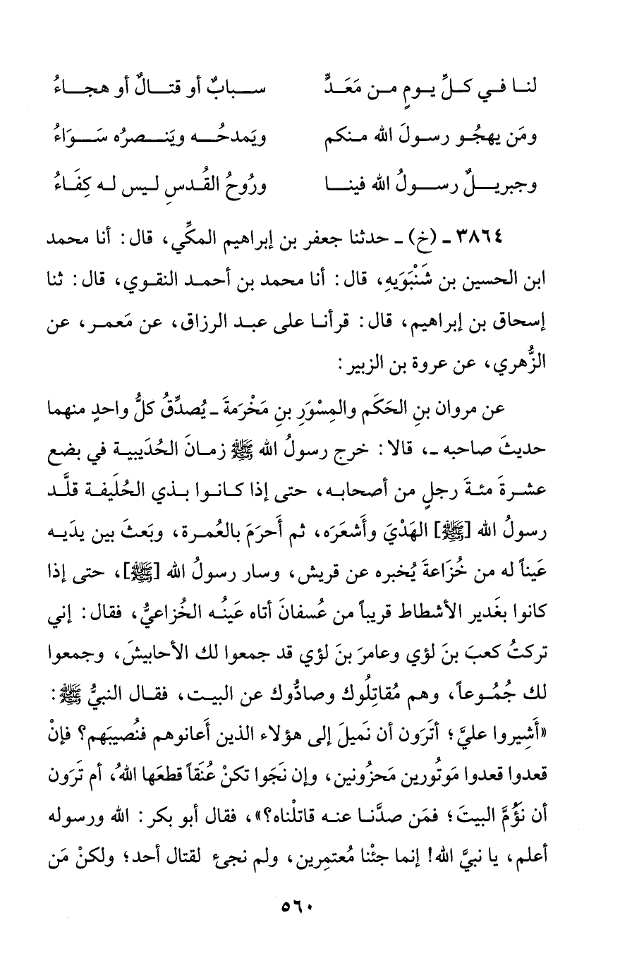 3864 - (خ) - حدثنا جعفر بن إبراهيم المكي، قال: أنا محمد بن الحسين بن شنبويه، قال: أنا محمد بن أحمد النقوي، قال: ثنا إسحاق بن إبراهيم، قال: قرأنا على عبد الرزاق، عن معمر، عن الزهري، عن عروة بن الزبير: