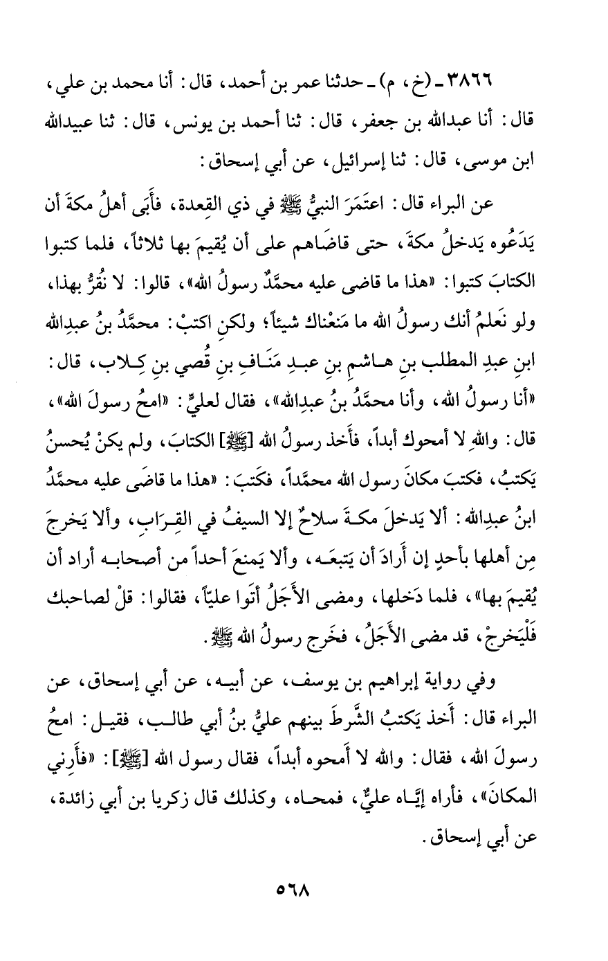 3866 - (خ، م) - حدثنا عمر بن أحمد، قال: أنا محمد بن علي، قال: أنا عبد الله بن جعفر، قال: ثنا أحمد بن يونس، قال: ثنا عبيد الله بن موسى، قال: ثنا إسرائيل، عن أبي إسحاق: