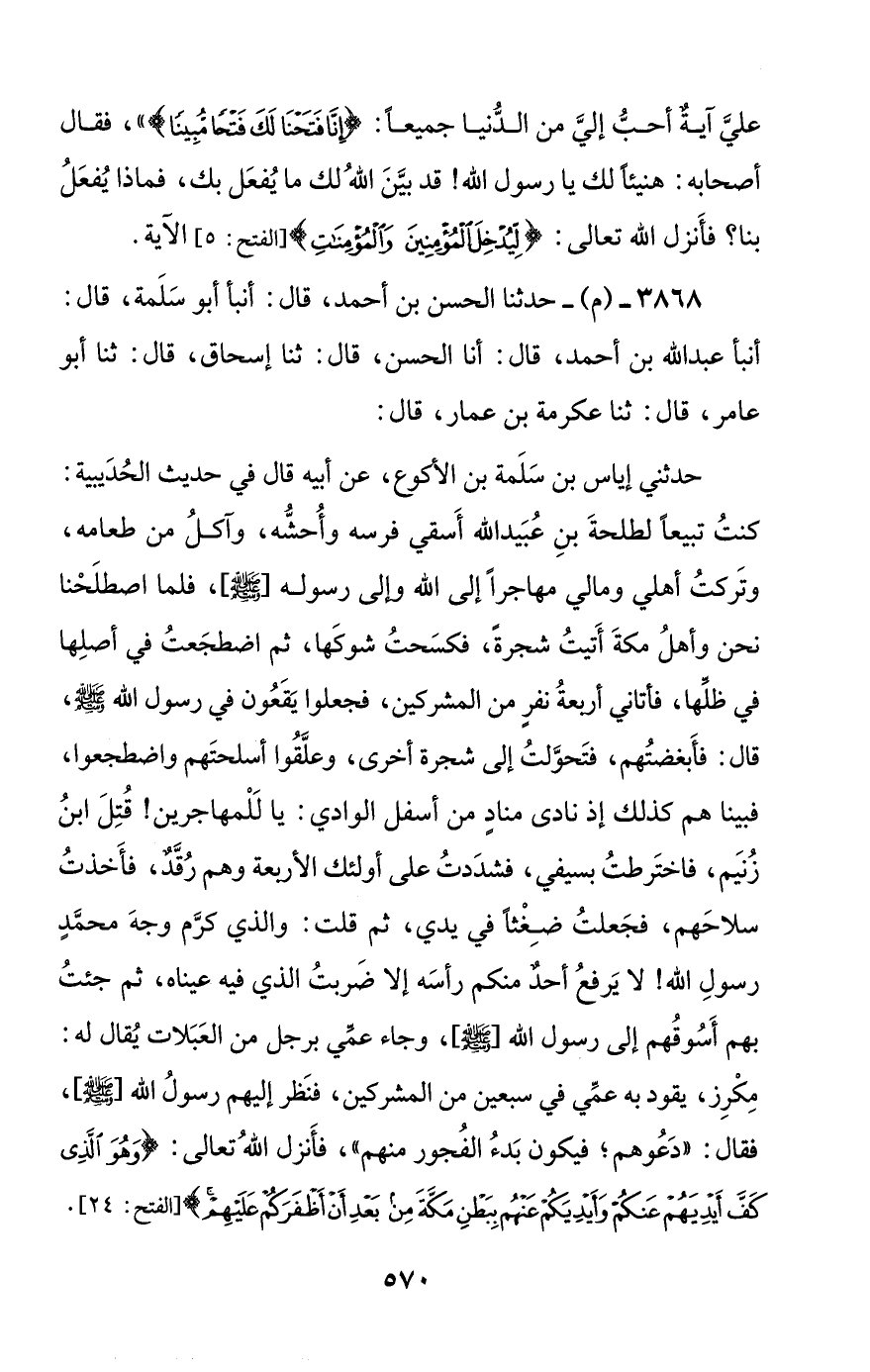 حدثني إياس بن سلمة بن الأكوع، عن أبيه قال في حديث الحديبية: كنت تبيعا لطلحة بن عبيد الله أسقي فرسه وأحشه، وآكل من طعامه، وتركت أهلي ومالي مهاجرا إلى الله وإلى رسوله [صلى الله عليه وسلم]، فلما اصطلحنا نحن وأهل مكة أتيت شجرة، فكسحت شوكها، ثم اضطجعت في أصلها في ظلها، فأتاني أربعة نفر من المشركين، فجعلوا يقعون في رسول الله صلى الله عليه وسلم، قال: فأبغضتهم، فتحولت إلى شجرة أخرى، وعلقوا أسلحتهم واضطجعوا، فبينا هم كذلك إذ نادى مناد من أسفل الوادي: يا للمهاجرين! قتل ابن زنيم، فاخترطت بسيفي، فشددت على أولئك الأربعة وهم رقد، فأخذت سلاحهم، فجعلت ضغثا في يدي، ثم قلت: والذي كرم وجه محمد رسول الله! لا يرفع أحد منكم رأسه إلا ضربت الذي فيه عيناه، ثم جئت بهم أسوقهم إلى رسول الله [صلى الله عليه وسلم]، وجاء عمي برجل من العبلات يقال له: مكرز، يقود به عمي في سبعين من المشركين، فنظر إليهم رسول الله [صلى الله عليه وسلم]، فقال: ((دعوهم؛ فيكون بدء الفجور منهم))، فأنزل الله تعالى: {وهو الذي كف أيديهم عنكم وأيديكم عنهم ببطن مكة من بعد أن أظفركم عليهم}.