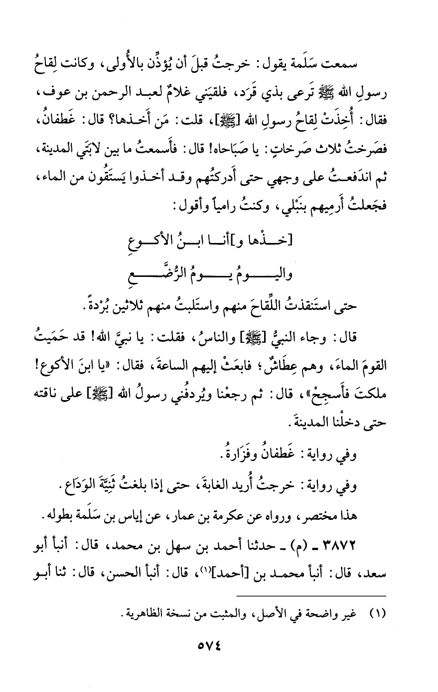 قال: يا ثكل أمي! أكوعي بكرة؟! قلت: نعم، أي عدو نفسه! وكان الذي رميته بكرة، فأتبعته بسهم آخر، فعلق فيه سهماي، ويخلفون فرسين، فجئت بهما أسوقهما إلى رسول الله [صلى الله عليه وسلم]، وهو على الماء الذي جليتهم عنه بذي قرد، فإذا رسول الله [صلى الله عليه وسلم] في خمسمئة، وإذا بلال قد نحر جزورا مما خلفت، فهو يشوي من كبدها وسنامها، فأتيت رسول الله [صلى الله عليه وسلم]، فقلت: يا رسول الله! خلني، فأنتخب من أصحابك مئة رجل، فآخذ على الكفار بالعشوة، فلا يبقى منهم مخبر إلا قتلته، #578# قال: ((أكنت فاعلا ذاك يا سلمة؟)) قلت: نعم، والذي أكرمك! فضحك رسول الله [صلى الله عليه وسلم] حتى رأيت نواجذه في ضوء النار، ثم قال: إنهم يقرون الآن بأرض غطفان، فجاء رجل من غطفان، فقال: مروا على فلان الغطفاني، فنحر لهم جزورا، فلما أخذوا يكشطون جلدها رأوا غبرة، فتركوها وخرجوا هرابا، فلما أصبحنا قال النبي صلى الله عليه وسلم: ((خير فرساننا اليوم: أبو قتادة، وخير رجالتنا: سلمة))، وأعطاني رسول الله [صلى الله عليه وسلم] سهم الراجل والفارس جميعا، ثم أردفني وراءه على العضباء راجعين إلى المدينة، فلما كان بيننا وبينها قريب من ضحوة، وفي القوم رجل من الأنصار وكان لا يسبق، فجعل ينادي: هل من مسابق؟ ألا رجل يسابق إلى المدينة؟ فعل ذلك مرارا وأنا وراء رسول الله صلى الله عليه وسلم مردفا، فقلت له: أما تكرم كريما ولا تهاب شريفا؟ قال: لا؛ إلا رسول الله [صلى الله عليه وسلم]، قلت: يا رسول الله بأبي أنت وأمي! خلني، فلأسابق الرجل، فقال: ((إن شئت))، فقلت: أذهب إليك، فطفر عن راحلته، وثنيت رجلي فطفرت عن الناقة، ثم إني ربطت عليها شرفا أو شرفين حتى استبقيت نفسي، ثم إني عدوت حتى ألحقه، فأصك بين كتفيه بيدي، فقلت: سبقتك والله، أو كلمة نحوها، قال: فضحك، وقال: إني أظن، حتى قدمنا المدينة.