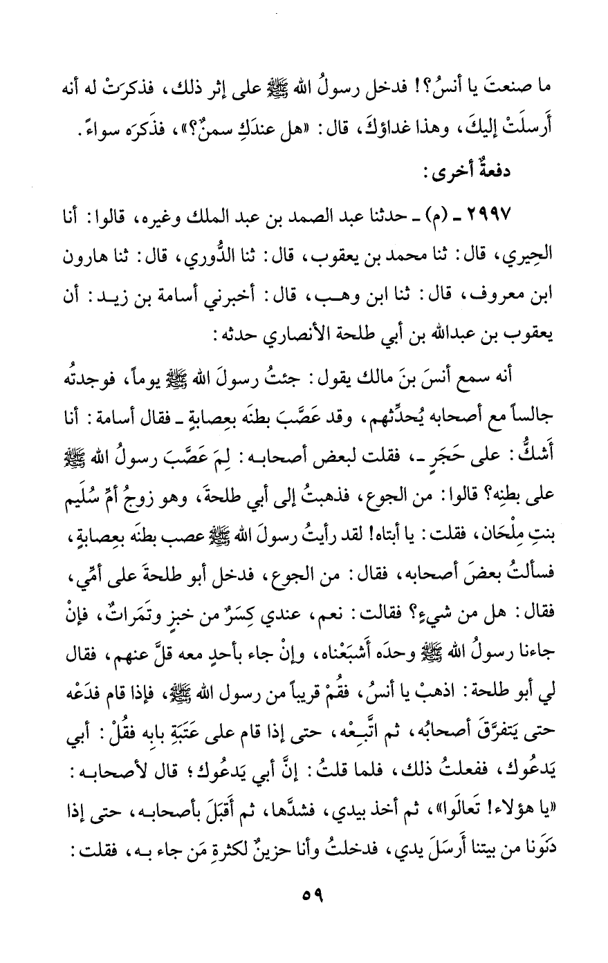 أنه سمع أنس بن مالك يقول: جئت رسول الله صلى الله عليه وسلم يوما، فوجدته جالسا مع أصحابه يحدثهم، وقد عصب بطنه بعصابة -فقال أسامة: أنا أشك: على حجر-، فقلت لبعض أصحابه: لم عصب رسول الله صلى الله عليه وسلم على بطنه؟ قالوا: من الجوع، فذهبت إلى أبي طلحة، وهو زوج أم سليم بنت ملحان، فقلت: يا أبتاه! لقد رأيت رسول الله صلى الله عليه وسلم عصب بطنه بعصابة، فسألت بعض أصحابه، فقال: من الجوع، فدخل أبو طلحة على أمي، فقال: هل من شيء؟ فقالت: نعم، عندي كسر من خبز وتمرات، فإن جاءنا رسول الله صلى الله عليه وسلم وحده أشبعناه، وإن جاء بأحد معه قل عنهم، فقال لي أبو طلحة: اذهب يا أنس، فقم قريبا من رسول الله صلى الله عليه وسلم، فإذا قام فدعه حتى يتفرق أصحابه، ثم اتبعه، حتى إذا قام على عتبة بابه فقل: أبي يدعوك، ففعلت ذلك، فلما قلت: إن أبي يدعوك؛ قال لأصحابه: ((يا هؤلاء! تعالوا))، ثم أخذ بيدي، فشدها، ثم أقبل بأصحابه، حتى إذا دنونا من بيتنا أرسل يدي، فدخلت وأنا حزين لكثرة من جاء به، فقلت: #60# يا أبتاه! قد قلت لرسول الله صلى الله عليه وسلم الذي قلت لي، فدعا أصحابه، وقد جاءك بهم، فخرج أبو طلحة إليهم، فقال: يا رسول الله! إنما أرسلت أنسا يدعوك وحدك، ولم يكن عندي ما يشبع ما أرى، فقال رسول الله صلى الله عليه وسلم: ((ادخل؛ فإن الله تعالى سيبارك فيما عندك))، فدخل رسول الله صلى الله عليه وسلم، فقال: ((اجمعوا ما عندكم، ثم قربوه))، وحبس من معه بالسدة، فقربنا ما كان عندنا من خبز وتمر، فجعلناه على حصيرنا، فدعا فيه بالبركة، فقال: ((يدخل علي ثمانية))، فدخلت عليه ثمانية، فجعل كفه فوق الطعام، فقال: ((كلوا، وسموا الله عز وجل))، فأكلوا من بين أصابعه حتى شبعوا، ثم أمرني أن أدخل عليه ثمانية، وقام الأولون، ففعلت، فدخلوا، فأكلوا حتى شبعوا، ثم أمرني فأدخلت عليه ثمانية، فما زال ذلك أمره حتى دخل عليه ثمانون رجلا، كلهم يأكل حتى يشبع، ثم دعاني ودعا أمي وأبا طلحة، فقال: ((كلوا))، فأكلنا حتى شبعنا، ثم رفع يده، فقال: ((يا أم سليم! أين هذا من طعامك حين قدمته؟!)) قالت: بأبي أنت وأمي! لولا أني رأيتهم يأكلون لقلت: ما نقص من طعامنا شيء.