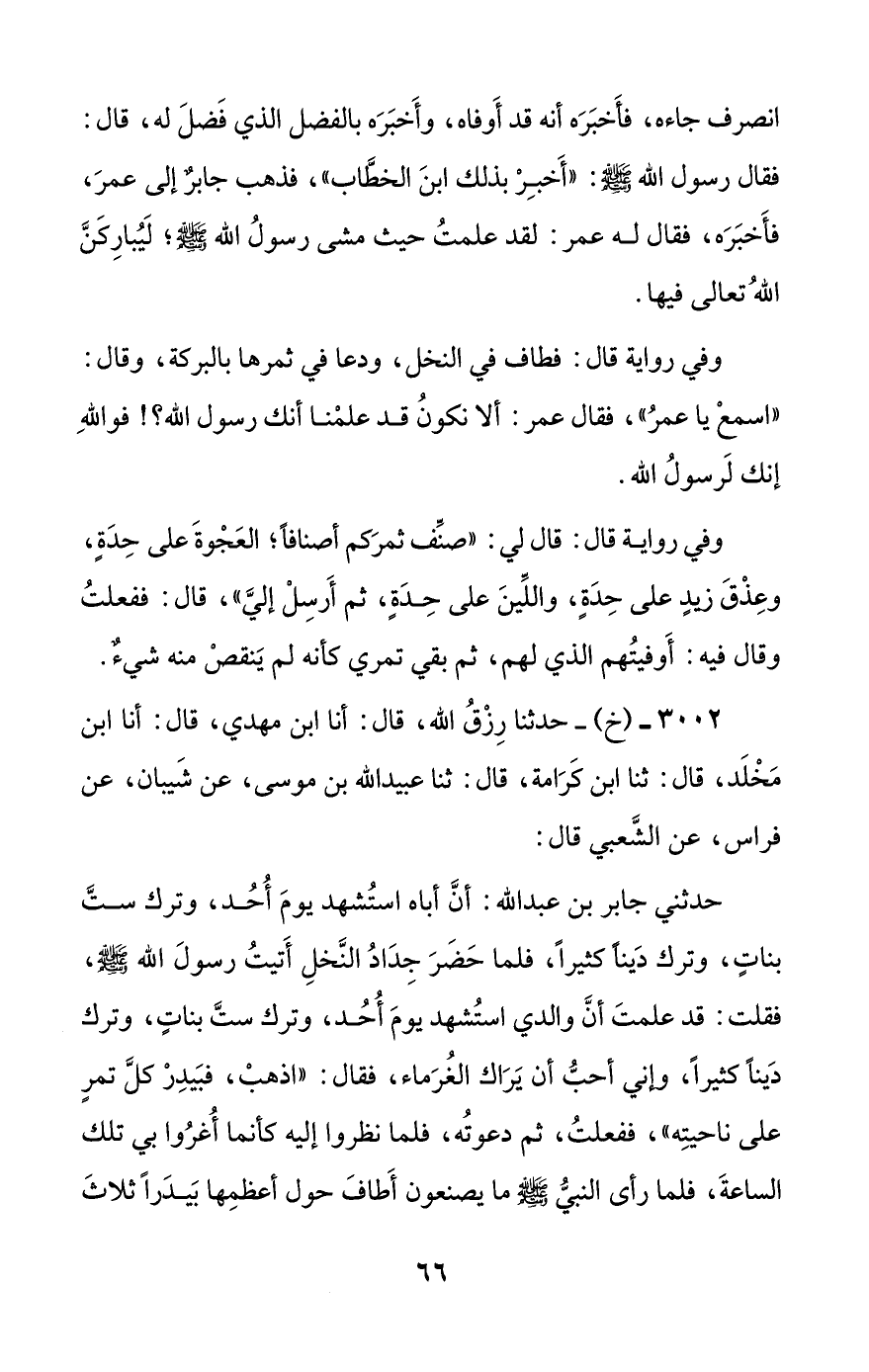 3002 - (خ) - حدثنا رزق الله، قال: أنا ابن مهدي، قال: أنا ابن مخلد، قال: ثنا ابن كرامة، قال: ثنا عبيد الله بن موسى، عن شيبان، عن فراس، عن الشعبي قال:
