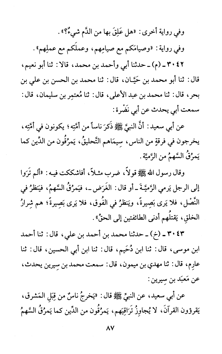 عن أبي سعيد، عن النبي صلى الله عليه وسلم قال: ((يخرج ناس من قبل المشرق، يقرؤون القرآن، لا يجاوز تراقيهم، يمرقون من الدين كما يمرق السهم #88# من الرمية، لا يعودون فيه حتى يعود السهم إلى فوقه))، قيل: ما سيماهم؟ قال: ((سيماهم التحليق، أو قال: التسبيد)).