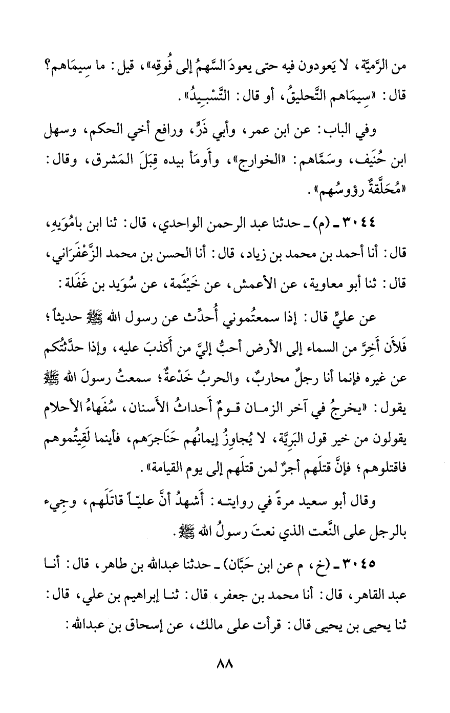 عن علي قال: إذا سمعتموني أحدث عن رسول الله صلى الله عليه وسلم حديثا؛ فلأن أخر من السماء إلى الأرض أحب إلي من أكذب عليه، وإذا حدثتكم عن غيره فإنما أنا رجل محارب، والحرب خدعة؛ سمعت رسول الله صلى الله عليه وسلم يقول: ((يخرج في آخر الزمان قوم أحداث الأسنان، سفهاء الأحلام يقولون من خير قول البرية، لا يجاوز إيمانهم حناجرهم، فأينما لقيتموهم فاقتلوهم؛ فإن قتلهم أجر لمن قتلهم إلى يوم القيامة)).