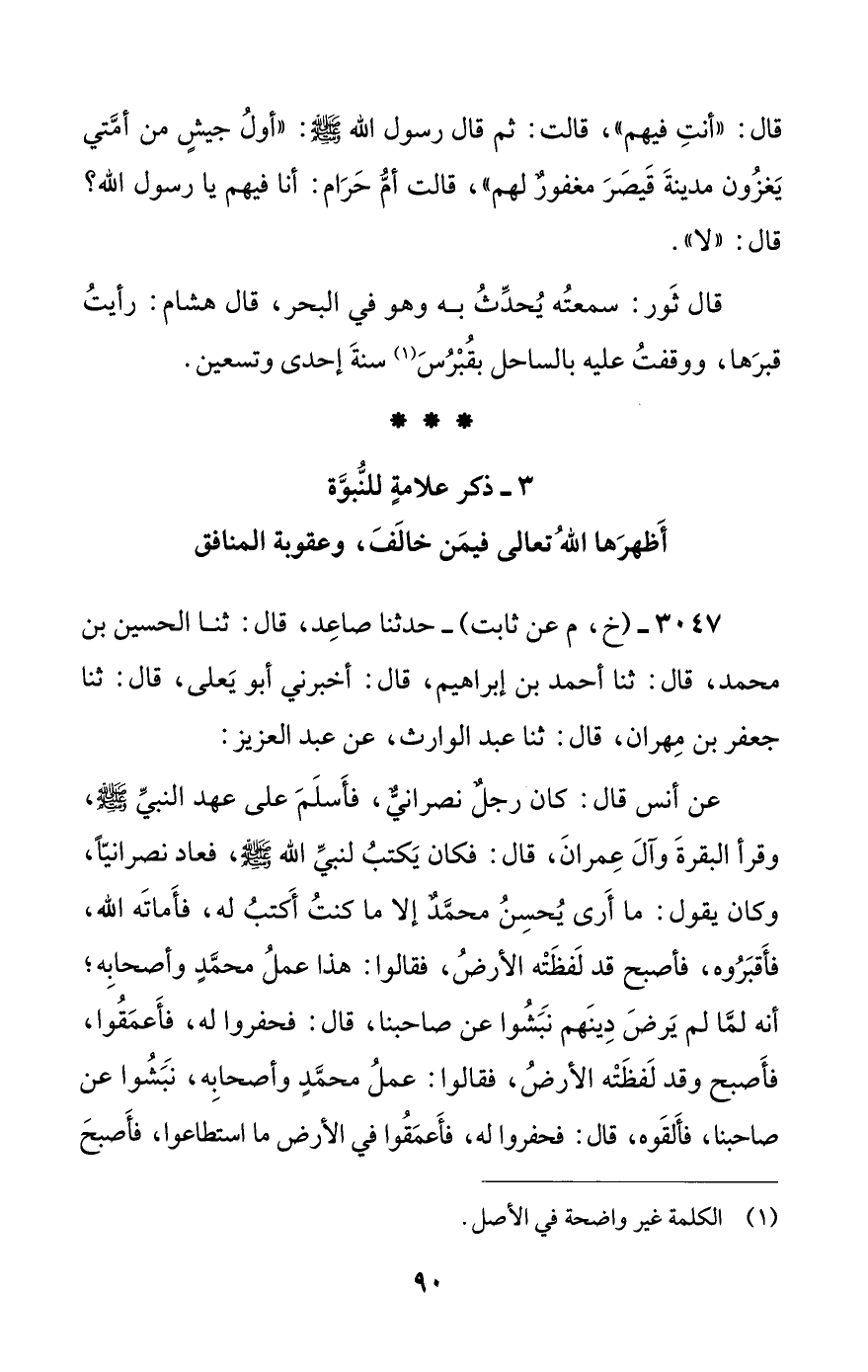 عن أنس قال: كان رجل نصراني، فأسلم على عهد النبي صلى الله عليه وسلم، وقرأ البقرة وآل عمران، قال: فكان يكتب لنبي الله صلى الله عليه وسلم، فعاد نصرانيا، وكان يقول: ما أرى يحسن محمد إلا ما كنت أكتب له، فأماته الله، فأقبروه، فأصبح قد لفظته الأرض، فقالوا: هذا عمل محمد وأصحابه؛ أنه لما لم يرض دينهم نبشوا عن صاحبنا، قال: فحفروا له، فأعمقوا، فأصبح وقد لفظته الأرض، فقالوا: عمل محمد وأصحابه، نبشوا عن صاحبنا، فألقوه، قال: فحفروا له، فأعمقوا في الأرض ما استطاعوا، فأصبح #91# وقد لفظته الأرض؛ فعلموا أنه ليس من الناس، وأنه من الله عز وجل، فألقوه.