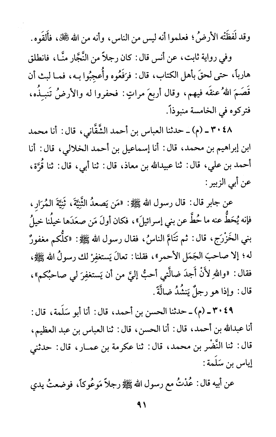 3048 - (م) - حدثنا العباس بن أحمد الشقاني، قال: أنا محمد بن إبراهيم بن محمد، قال: أنا إسماعيل بن أحمد الخلالي، قال: أنا أحمد بن علي، قال: ثنا عبيد الله بن معاذ، قال: ثنا أبي، قال: ثنا قرة، عن أبي الزبير: