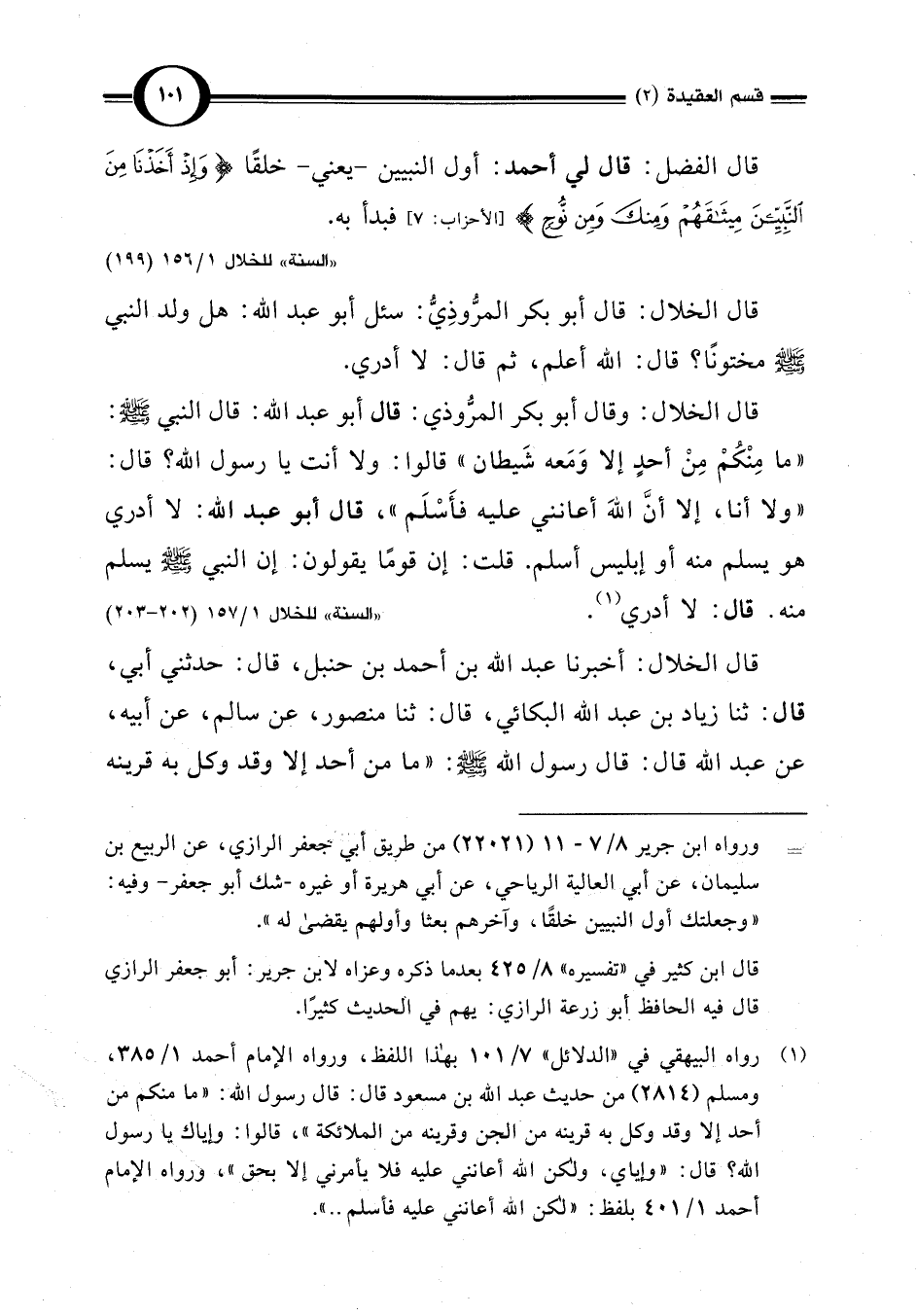 قال الخلال: وقال أبو بكر المرُّوذي: قال أبو عبد اللَّه: قال النبي -صلى اللَّه عليه وسلم-: "ما مِنْكُمْ مِنْ أحدٍ إلا وَمَعه شَيطانٌ" قالوا: ولا أنت يا رسول اللَّه؟ قال: "ولا أنا، إلا أنَّ اللَّهَ أعانني عليه فأَسْلَم"، قال أبو عبد اللَّه: لا أدري هو يسلم منه أو إبليس أسلم. قلت: إن قومًا يقولون: إن النبي -صلى اللَّه عليه وسلم- يسلم منه. قال: لا أدري (¬1).