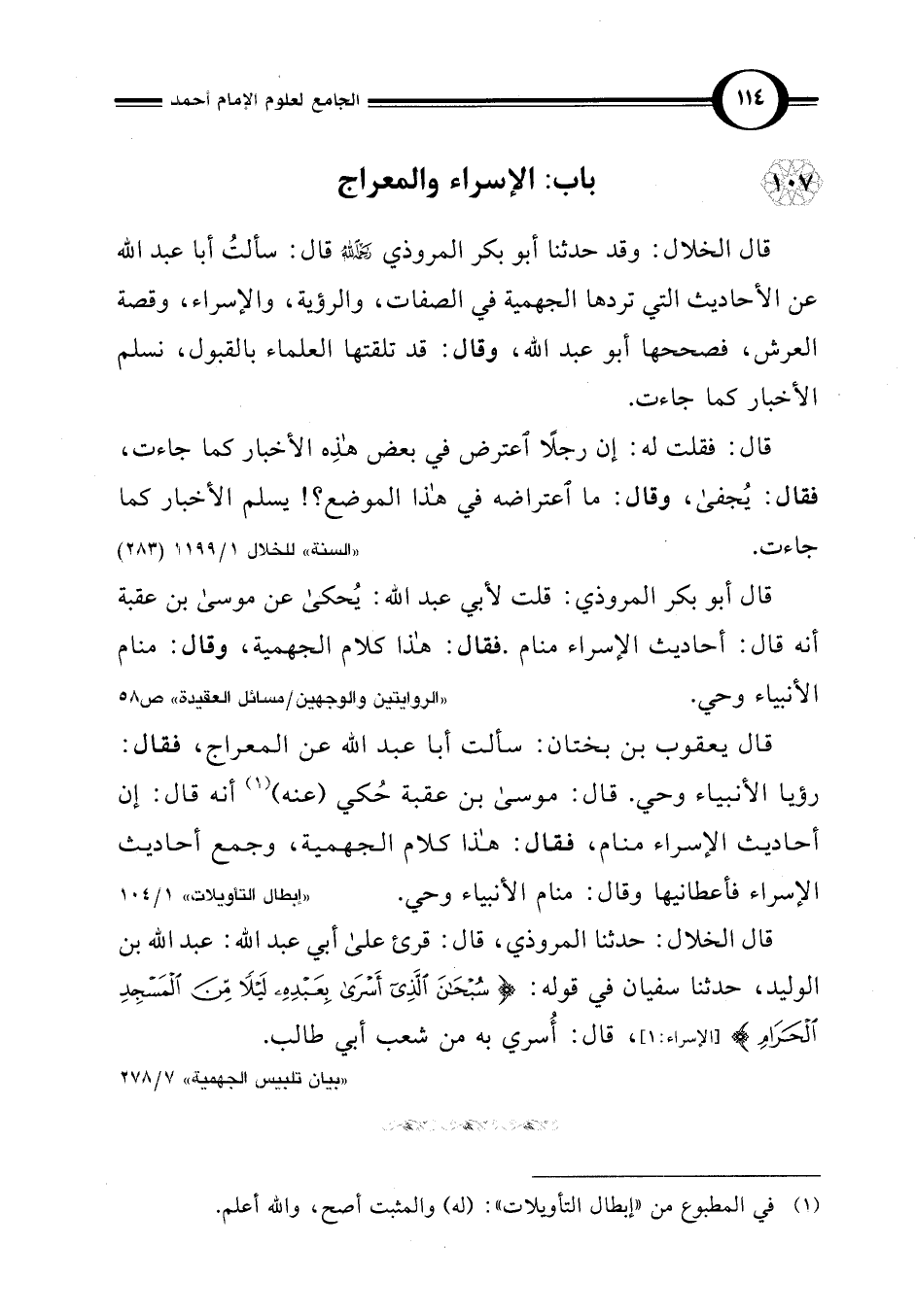 قال أبو بكر المروذي: قلت لأبي عبد اللَّه: يُحكى عن موسى بن عقبة أنه قال: أحاديث الإسراء منام. فقال: هذا كلام الجهمية، وقال: منام الأنبياء وحي.