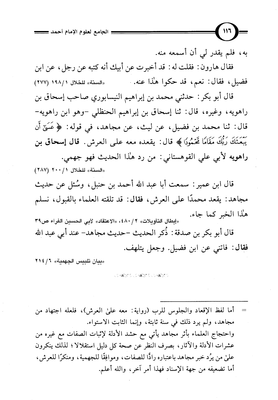 قال ابن عمير: سمعت أبا عبد اللَّه أحمد بن حنبل، وسُئل عن حديث مجاهد: يقعد محمدًا على العرش، فقال: قد تلقته العلماء بالقبول، نسلم هذا الخبر كما جاء.