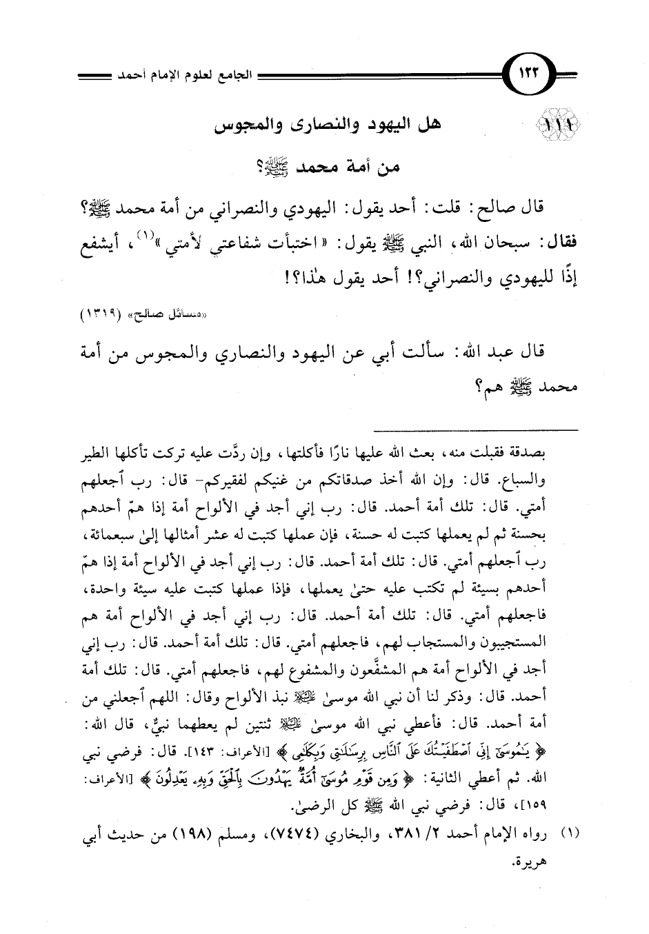 قال عبد اللَّه: سألت أبي عن اليهود والنصاري والمجوس من أمة محمد صلى اللَّه عليه وسلم هم؟