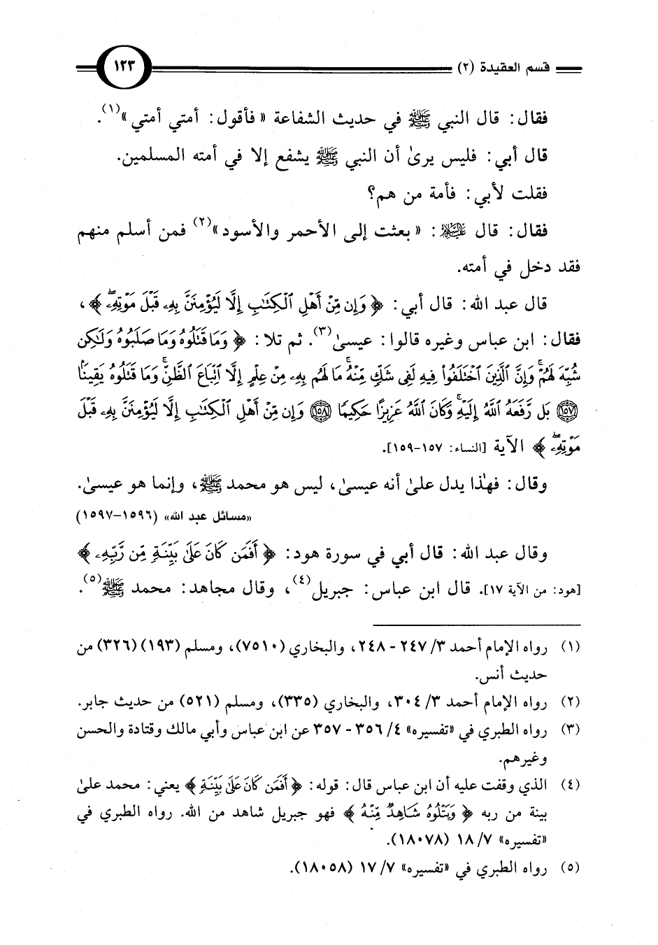قال عبد اللَّه: قال أبي: {وَإِنْ مِنْ أَهْلِ الْكِتَابِ إِلَّا لَيُؤْمِنَنَّ بِهِ قَبْلَ مَوْتِهِ}، فقال: ابن عباس وغيره قالوا: عيسى (¬3). ثم تلا: {وَمَا قَتَلُوهُ وَمَا صَلَبُوهُ وَلَكِنْ شُبِّهَ لَهُمْ وَإِنَّ الَّذِينَ اخْتَلَفُوا فِيهِ لَفِي شَكٍّ مِنْهُ مَا لَهُمْ بِهِ مِنْ عِلْمٍ إِلَّا اتِّبَاعَ الظَّنِّ وَمَا قَتَلُوهُ يَقِينًا (157) بَلْ رَفَعَهُ اللَّهُ إِلَيْهِ وَكَانَ اللَّهُ عَزِيزًا حَكِيمًا (158) وَإِنْ مِنْ أَهْلِ الْكِتَابِ إِلَّا لَيُؤْمِنَنَّ بِهِ قَبْلَ مَوْتِهِ} [النساء: 157 - 159].