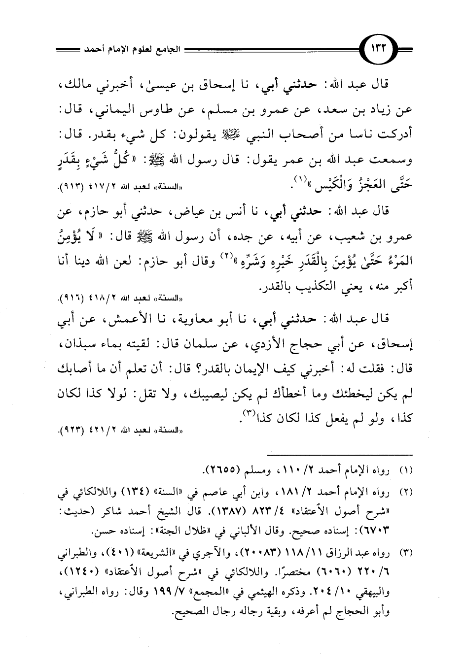 قال عبد اللَّه: حدثني أبي، نا أنس بن عياض، حدثني أبو حازم، عن عمرو بن شعيب، عن أبيه، عن جده، أن رسول اللَّه -صلى اللَّه عليه وسلم- قال: "لَا يُؤْمِنُ المَرْءُ حَتَّى يُؤْمِن بِالْقَدَرِ خَيْرِهِ وَشَرِّهِ" (¬2) وقال أبو حازم: لعن اللَّه دينا أنا أكبر منه، يعني التكذيب بالقدر.