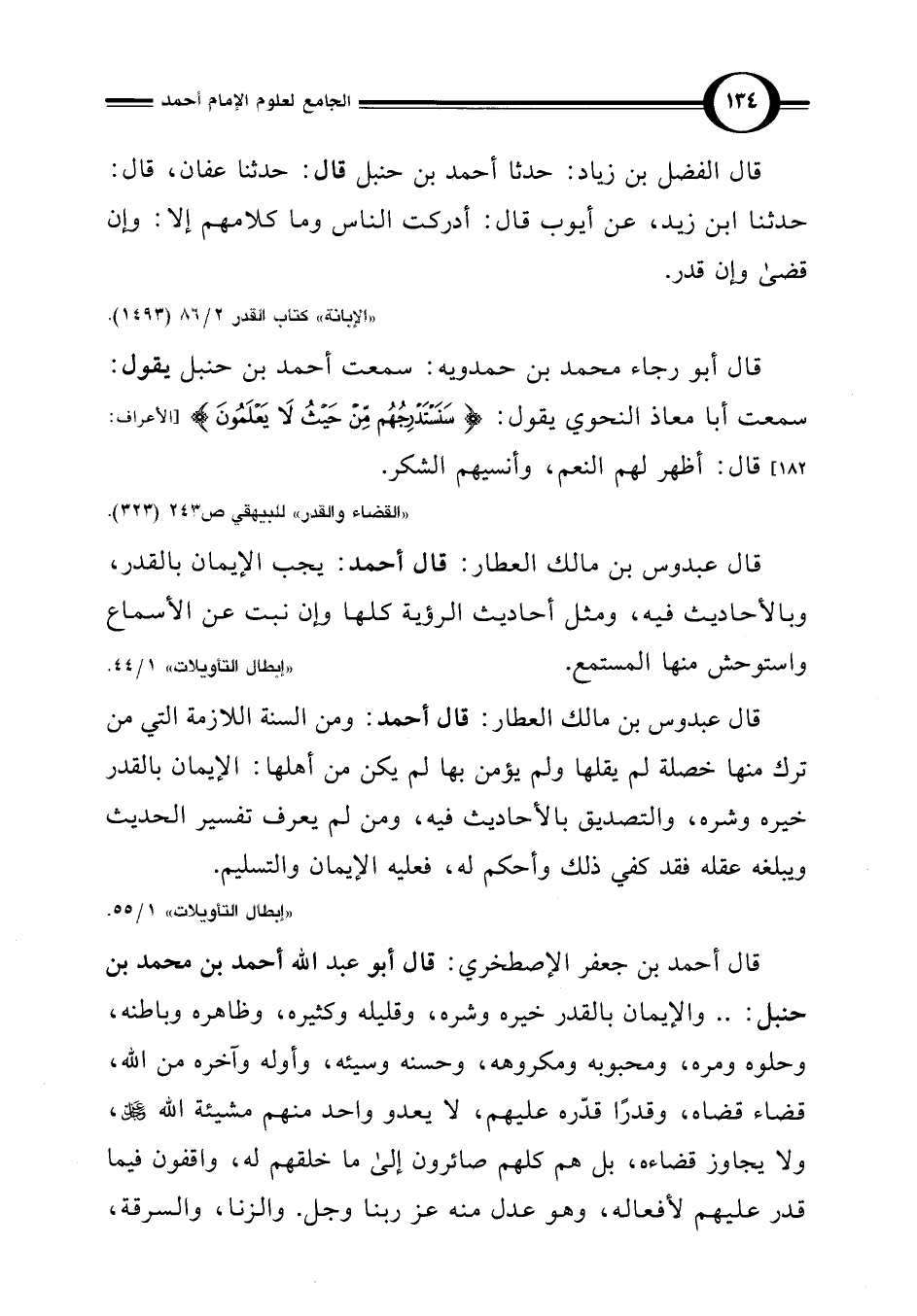 قال أحمد بن جعفر الإصطخري: قال أبو عبد اللَّه أحمد بن محمد بن حنبل: . . والإيمان بالقدر خيره وشره، وقليله وكثيره، وظاهره وباطنه، وحلوه ومره، ومحبوبه ومكروهه، وحسنه وسيئه، وأوله وآخره من اللَّه، قضاء قضاه، وقدرًا قدّره عليهم، لا يعدو واحد منهم مشيئة اللَّه، ولا يجاوز قضاءه، بل هم كلهم صائرون إلى ما خلقهم له، واقفون فيما قدر عليهم لأفعاله، وهو عدل منه عز ربنا وجل. والزنا، والسرقة،