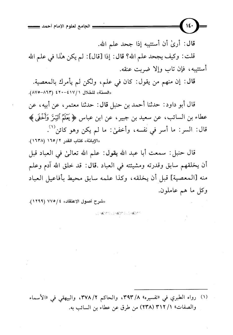 قال حنبل: سمعت أبا عبد اللَّه يقول: علم اللَّه تعالى في العباد قبل أن يخلقهم سابق وقدرته ومشيئته في العباد. قال: قد خلق اللَّه آدم وعلم منه [المعصية] قبل أن يخلقه، وكذا علمه سابق محيط بأفاعيل العباد وكل ما هم عاملون.