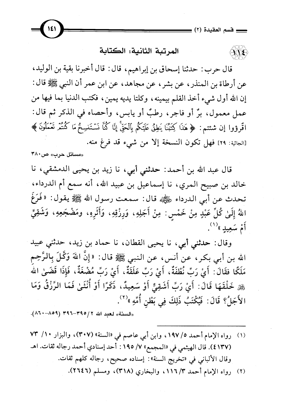 قال حرب: حدثنا إسحاق بن إبراهيم، قال: قال أخبرنا بقية بن الوليد، عن أرطاة بن المنذر، عن بشر، عن مجاهد، عن ابن عمر أن النبي -صلى اللَّه عليه وسلم- قال: إن اللَّه أول شيء أخذ القلم بيمينه، وكلتا يديه يمين، فكتب الدنيا بما فيها من عمل معمول، برٌّ أو فاجر، رطبٌ أو يابس، وأحصاه في الذكر ثم قال: اقرؤوا إن شئتم: {هَذَا كِتَابُنَا يَنْطِقُ عَلَيْكُمْ بِالْحَقِّ إِنَّا كُنَّا نَسْتَنْسِخُ مَا كُنْتُمْ تَعْمَلُونَ (29)} [الجاثية: 29] فهل تكون النسخة إلا من شيء قد فرغ منه.
