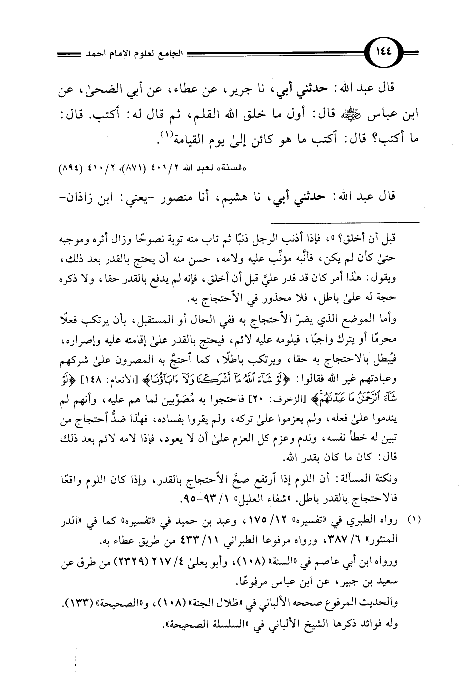 قال عبد اللَّه: حدثني أبي، نا جرير، عن عطاء، عن أبي الضحى، عن عباس رضي اللَّه عنه قال: أول ما خلق اللَّه القلم، ثم قال له: اكتب. قال: اكتب؟ قال: اكتب ما هو كائن إلى يوم القيامة (¬1).