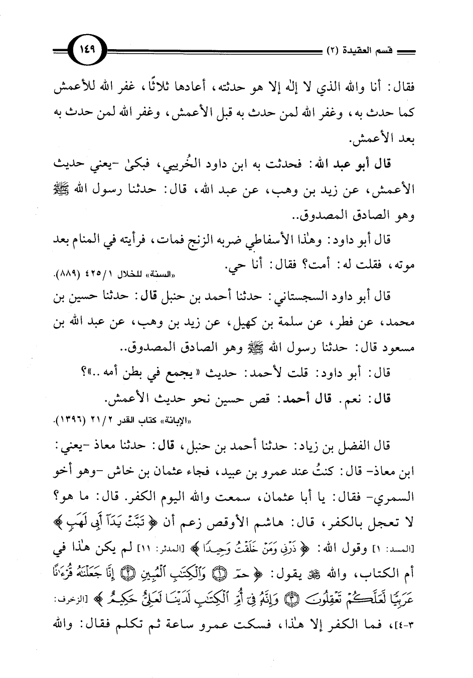 قال الفضل بن زياد: حدثنا أحمد بن حنبل، قال: حدثنا معاذ -يعني: ابن معاذ- قال: كنتُ عند عمرو بن عبيد، فجاء عثمان بن خاش -وهو أخو السمري- فقال: يا أبا عثمان، سمعت واللَّه اليوم الكفر. قال: ما هو؟ لا تعجل بالكفر، قال: هاشم الأوقص زعم أن {تَبَّت يَدَا أَبِي لَهَبٍ} [المسد: 1] وقول اللَّه: {ذَرْنِي وَمَنْ خَلَقْتُ وَحِيدًا} [المدثر: 11] لم يكن هذا في أم الكتاب، واللَّه يقول: {حم (1) وَالْكِتَابِ الْمُبِينِ (2) إِنَّا جَعَلْنَاهُ قُرْآنًا عَرَبِيًّا لَعَلَّكُمْ تَعْقِلُونَ (3) وَإِنَّهُ فِي أُمِّ الْكِتَابِ لَدَيْنَا لَعَلِيٌّ حَكِيمٌ (4)} [الزخرف: 1 - 3]، فما الكفر إلا هذا، فسكت عمرو ساعة ثم تكلم فقال: واللَّه