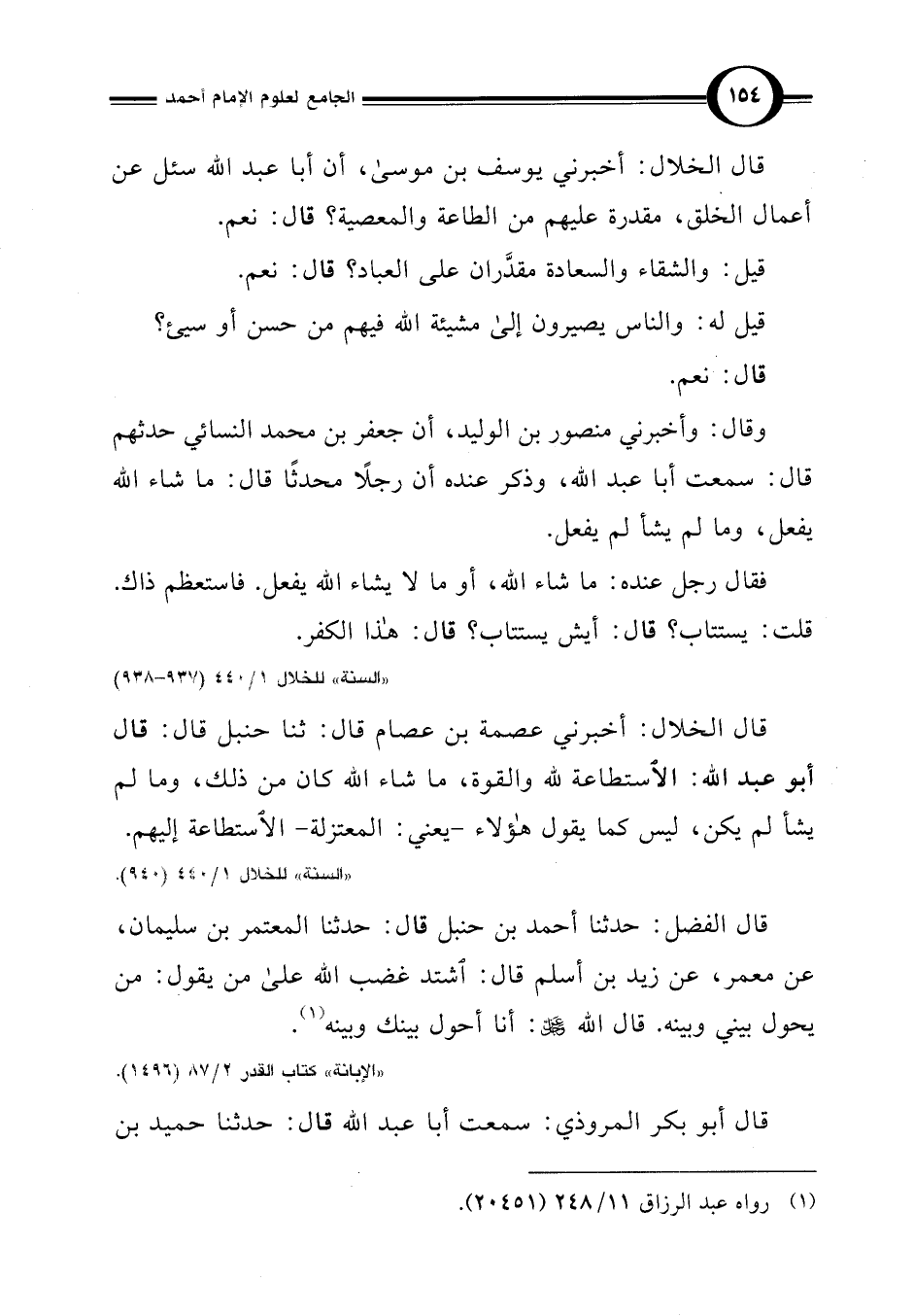 قال الخلال: أخبرني عصمة بن عصام قال: ثنا حنبل قال: قال أبو عبد اللَّه: الاستطاعة للَّه والقوة، ما شاء اللَّه كان من ذلك، وما لم يشأ لم يكن، ليس كما يقول هؤلاء -يعني: المعتزلة- الاستطاعة إليهم.