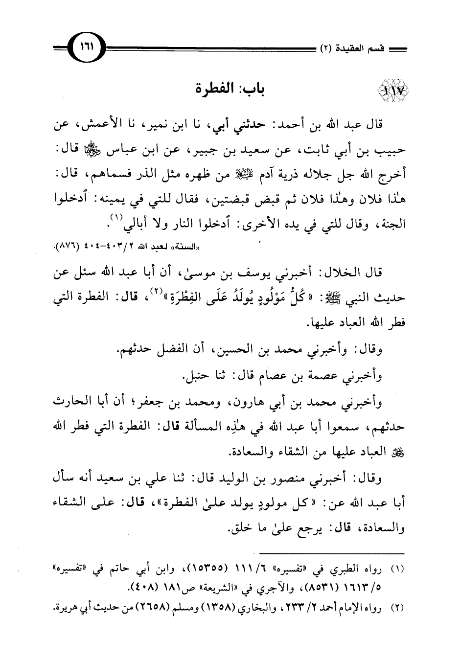 وقال: أخبرني منصور بن الوليد قال: ثنا علي بن سعيد أنه سأل أبا عبد اللَّه عن: "كل مولودٍ يولد على الفطرة"، قال: على الشقاء والسعادة، قال: يرجع على ما خلق.