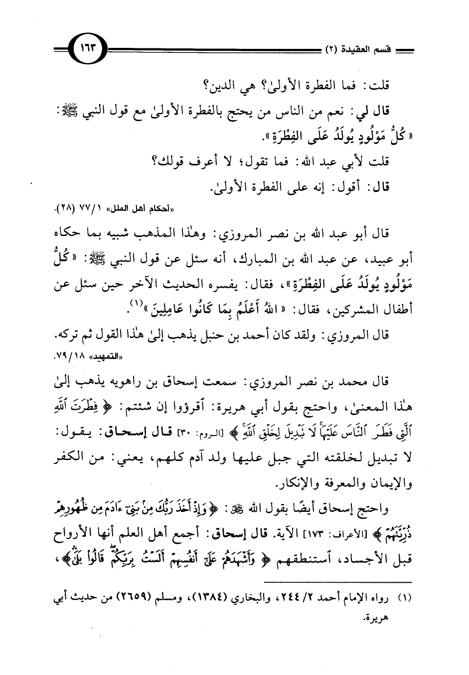 قال لي: نعم من الناس من يحتج بالفطرة الأولى مع قول النبي -صلى اللَّه عليه وسلم-: "كلُّ مَوْلُودٍ يُولَدُ عَلَى الفِطْرَةِ".