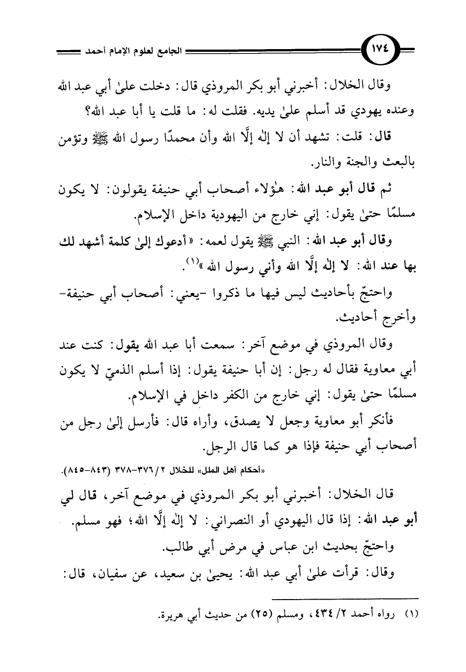 وقال المروذي في موضع آخر: سمعت أبا عبد اللَّه يقول: كنت عند أبي معاوية فقال له رجل: إن أبا حنيفة يقول: إذا أسلم الذميّ لا يكون مسلمًا حتى يقول: إني خارج من الكفر داخل في الإسلام.