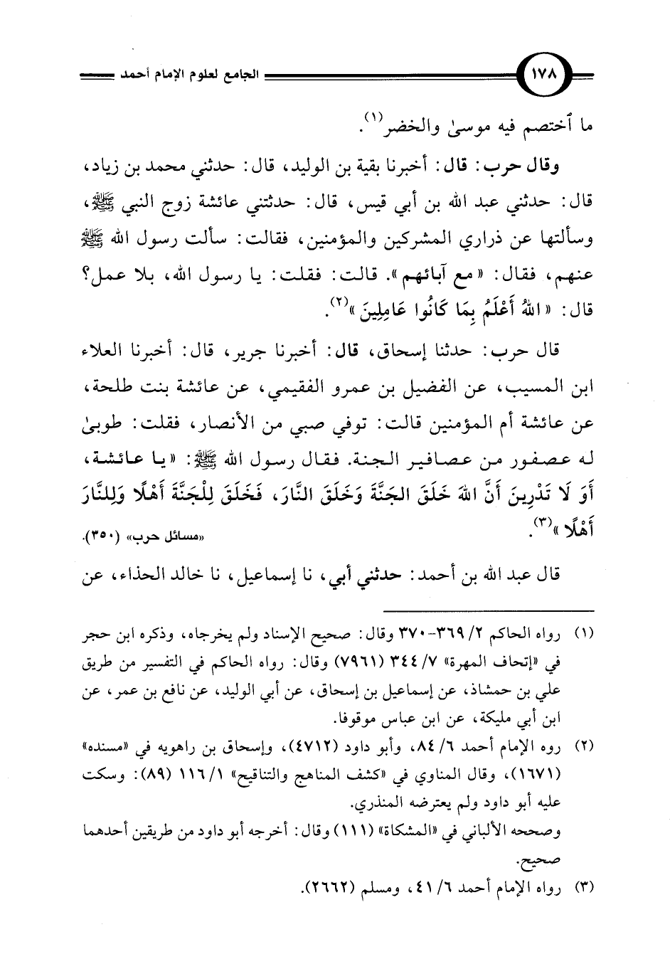 قال حرب: حدثنا إسحاق، قال: أخبرنا جرير، قال: أخبرنا العلاء ابن المسيب، عن الفضيل بن عمرو الفقيمي، عن عائشة بنت طلحة، عن عائشة أم المؤمنين قالت: توفي صبي من الأنصار، فقلت: طوبى له عصفور من عصافير الجنة. فقال رسول اللَّه -صلى اللَّه عليه وسلم-: "يا عائشة، أَوَ لَا تَدْرِينَ أَنَّ اللَّهَ خَلَقَ الجَنَّةَ وَخَلَقَ النَّارَ، فَخَلَقَ لِلْجَنَّةَ أَهْلًا وَللنَّارَ أَهْلًا" (¬3).