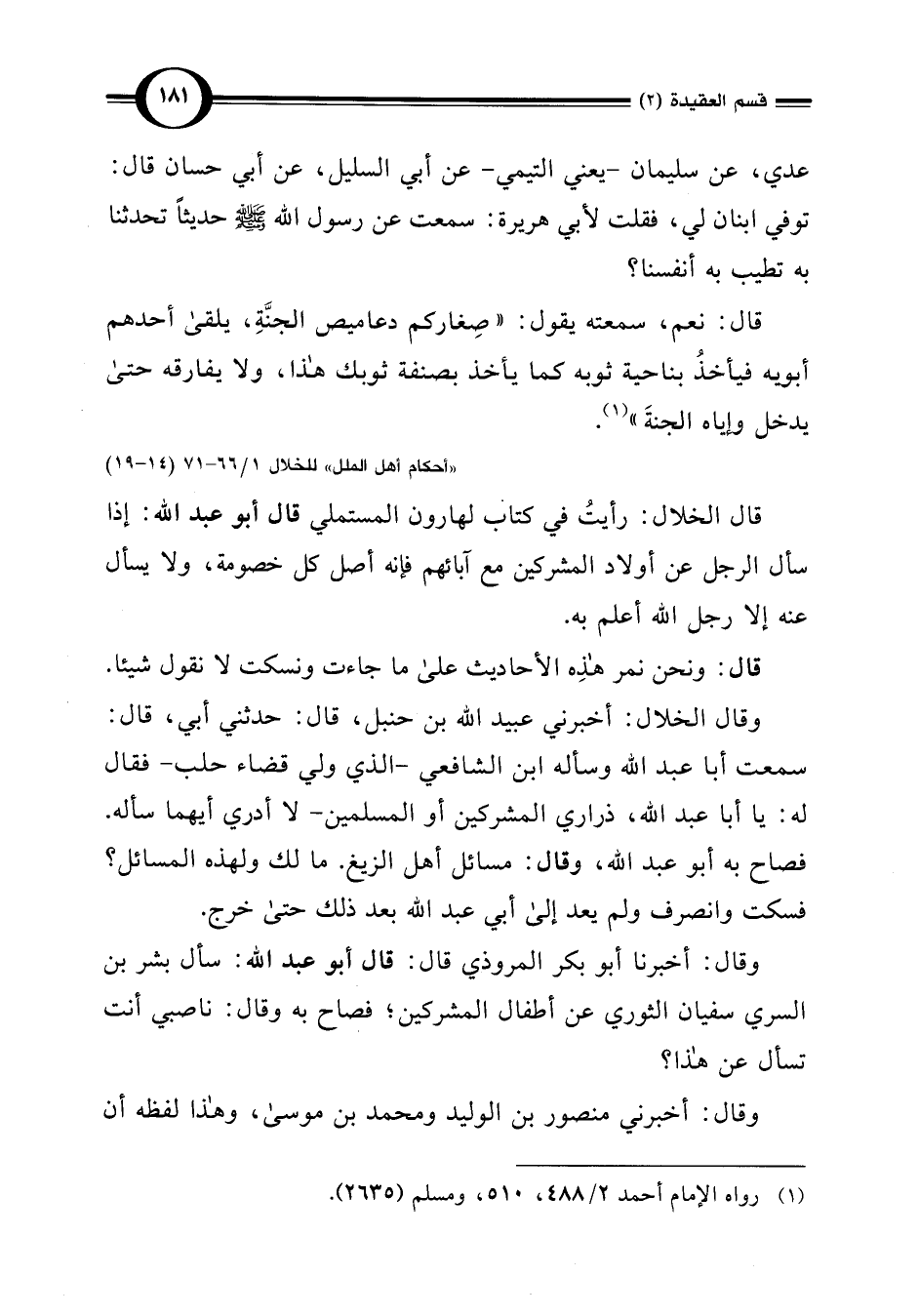 قال الخلال: رأيتُ في كتاب لهارون المستملي قال أبو عبد اللَّه: إذا سأل الرجل عن أولاد المشركين مع آبائهم فإنه أصل كل خصومة، ولا يسأل عنه إلا رجل اللَّه أعلم به.