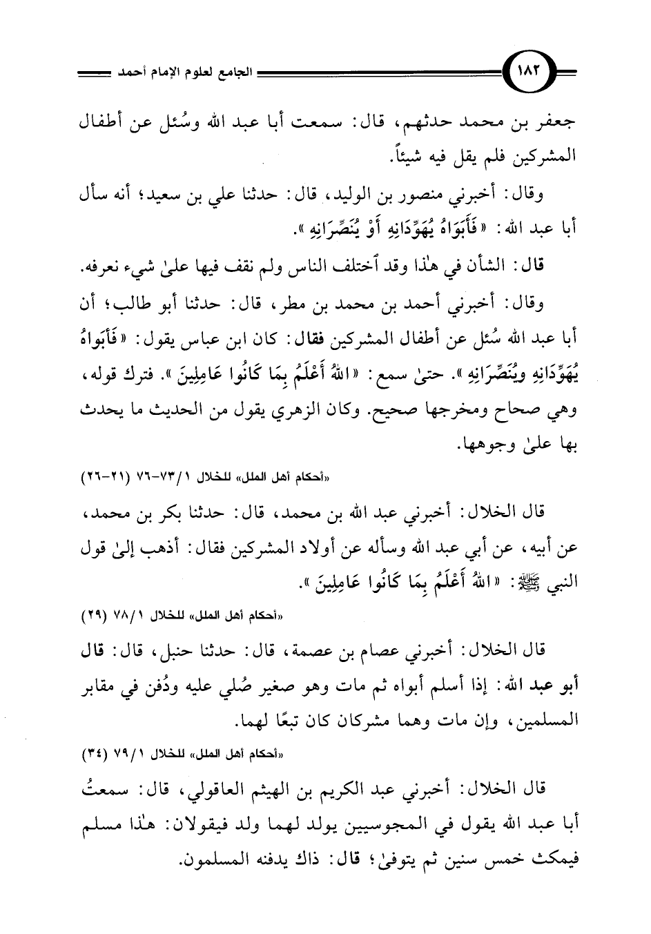 قال الخلال: أخبرني عبد اللَّه بن محمد، قال: حدثنا بكر بن محمد، عن أبيه، عن أبي عبد اللَّه وسأله عن أولاد المشركين فقال: أذهب إلى قول النبي -صلى اللَّه عليه وسلم-: "اللَّهُ أَعْلَمُ بِمَا كَانُوا عَامِلِينَ".
