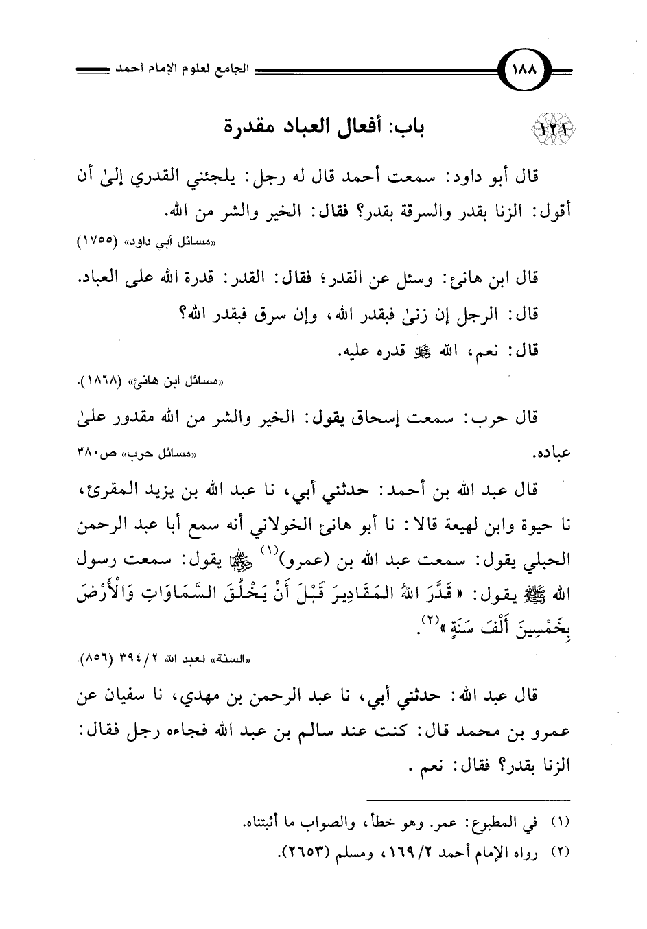 قال حرب: سمعت إسحاق يقول: الخير والشر من اللَّه مقدور على عباده.