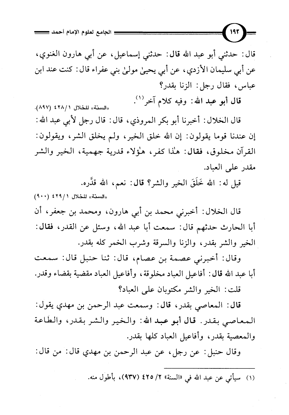 قال: المعاصي بقدر، قال: وسمعت عبد الرحمن بن مهدي يقول: المعاصي بقدر. قال أبو عبد اللَّه: والخير والشر بقدر، والطاعة والمعصية بقدر، وأفاعيل العباد كلها بقدر.