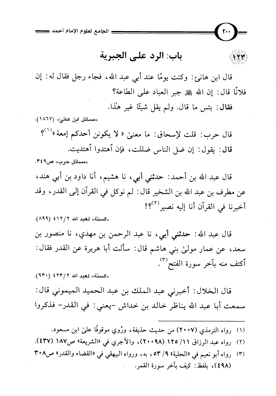 قال عبد اللَّه: حدثني أبي، نا عبد الرحمن بن مهدي، نا منصور بن سعد، عن عمار مولى بني هاشم قال: سألت أبا هريرة عن القدر فقال: اكتف منه بآخر سورة الفتح (¬3).