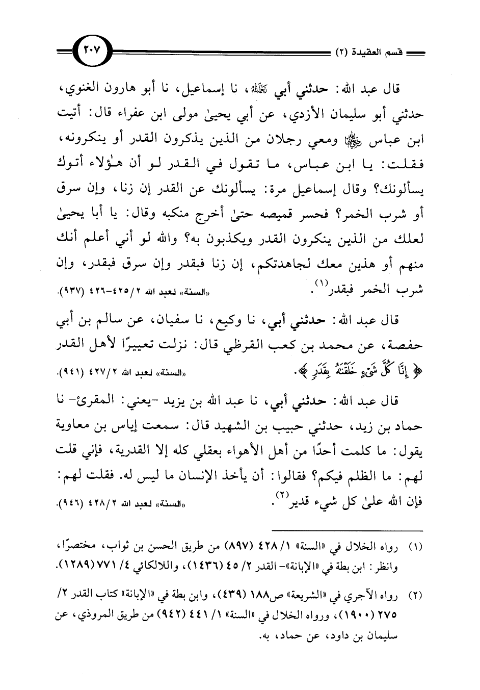 (¬2) رواه الآجري في "الشريعة" ص 188 (439)، وابن بطة في "الإبانة" كتاب القدر 2/ 275 (1900)، ورواه الخلال في "السنة" 1/ 441 (942) من طريق المروذي، عن سليمان بن داود، عن حماد، به.